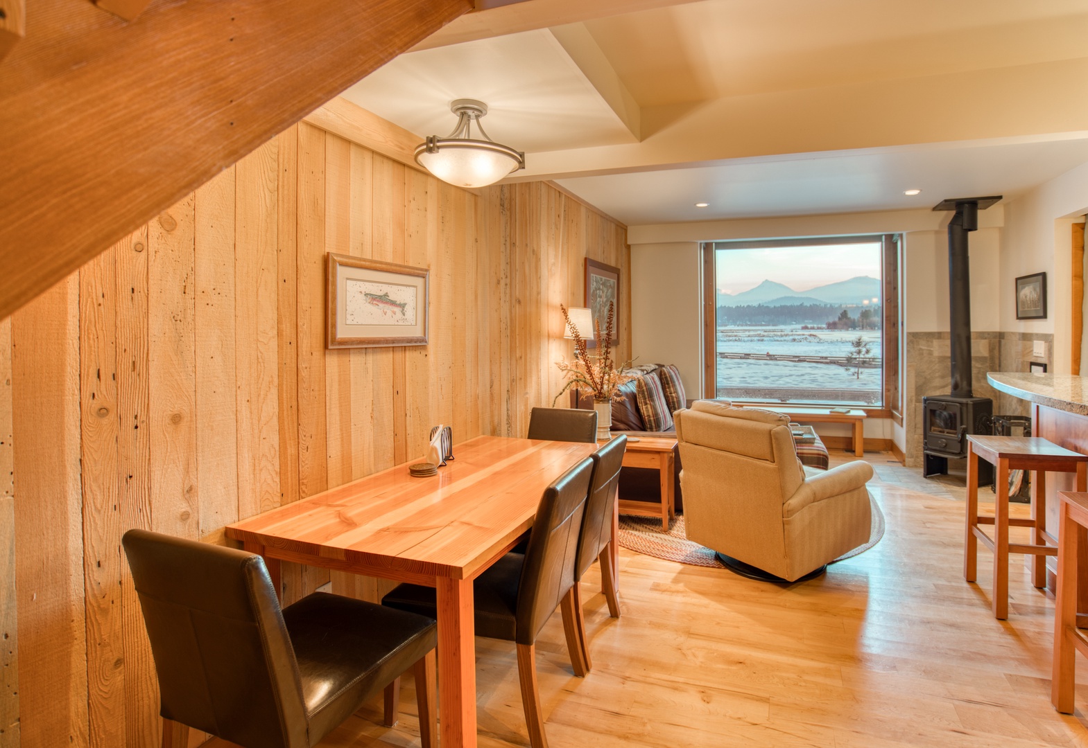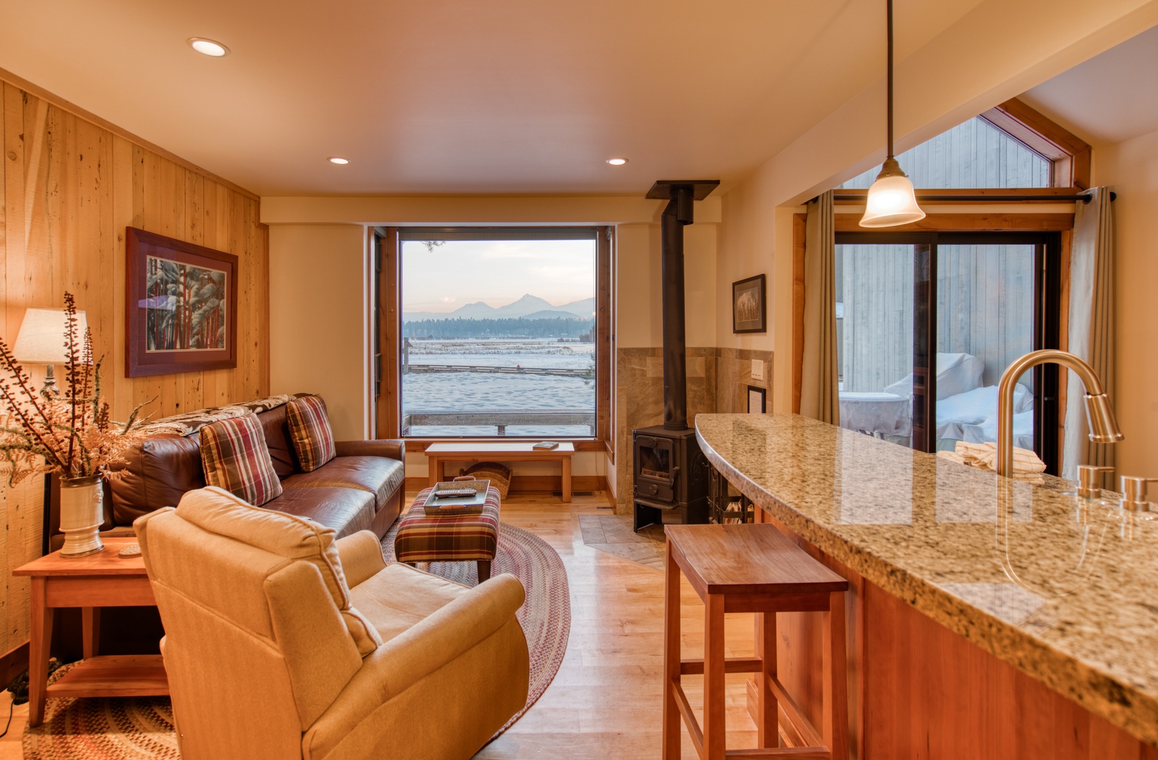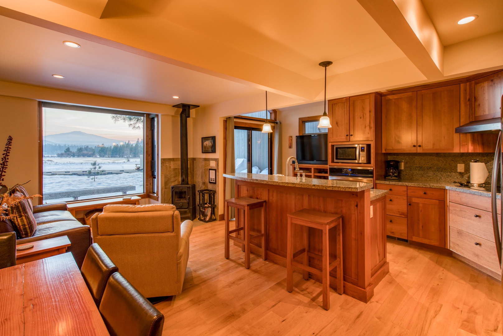 Enjoy the views of Phalarope Lake and the Three Sisters Mountain through the large picture windows and unique skybox architecture from the comfort of the couch. Just off the living room is a spacious deck feature easy step down access to the grassy area in front of the condo, and new patio furniture for lounging and dining. Also located on the main level of this two story condo is one full size bathroom and one guest bedroom with a new Beauty Rest pillow top queen size bed, new bedding, wall mounted flat screen TV, end tables, good lighting, and stackable washer and dryer hidden away in a laundry closet.