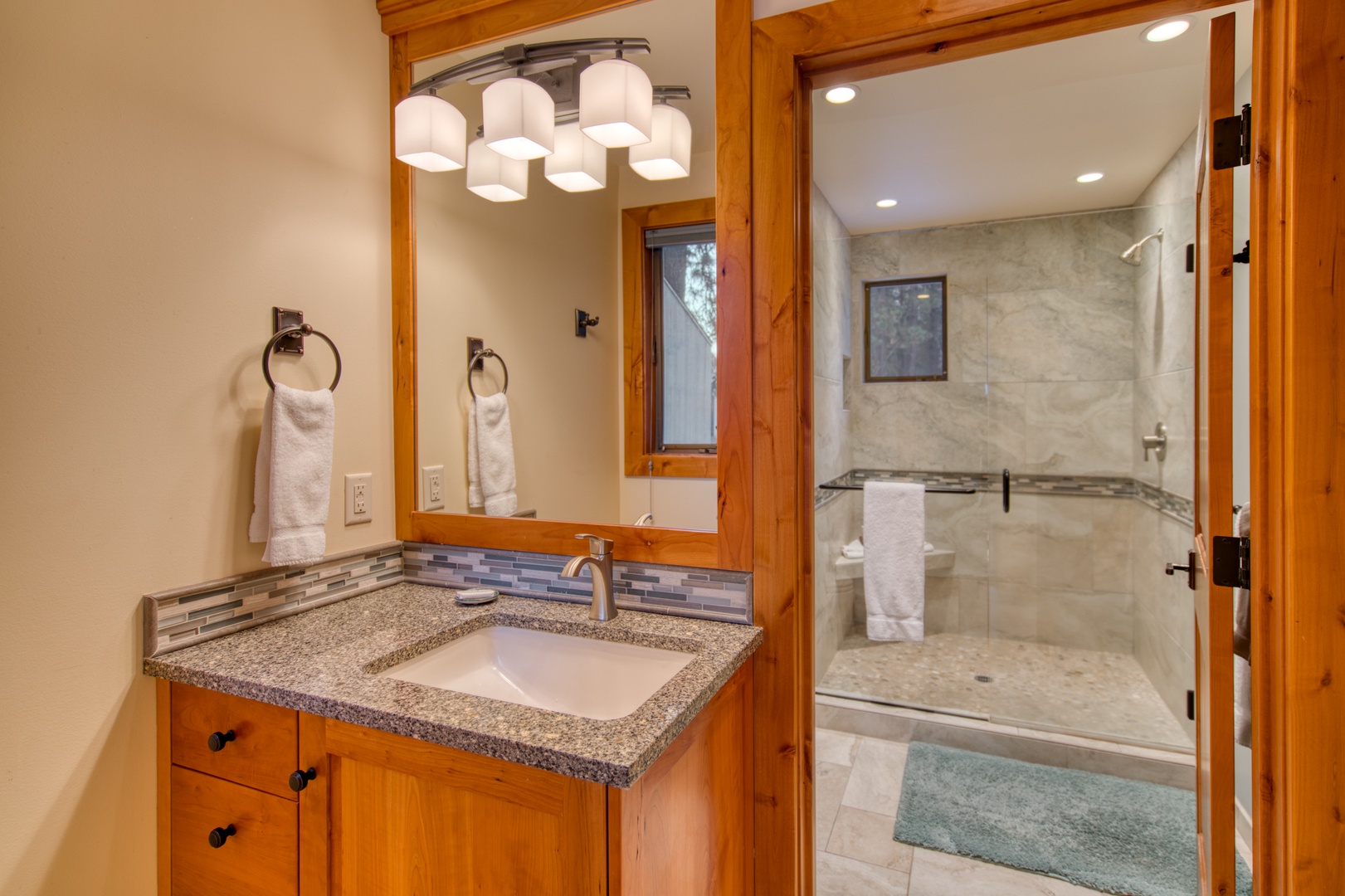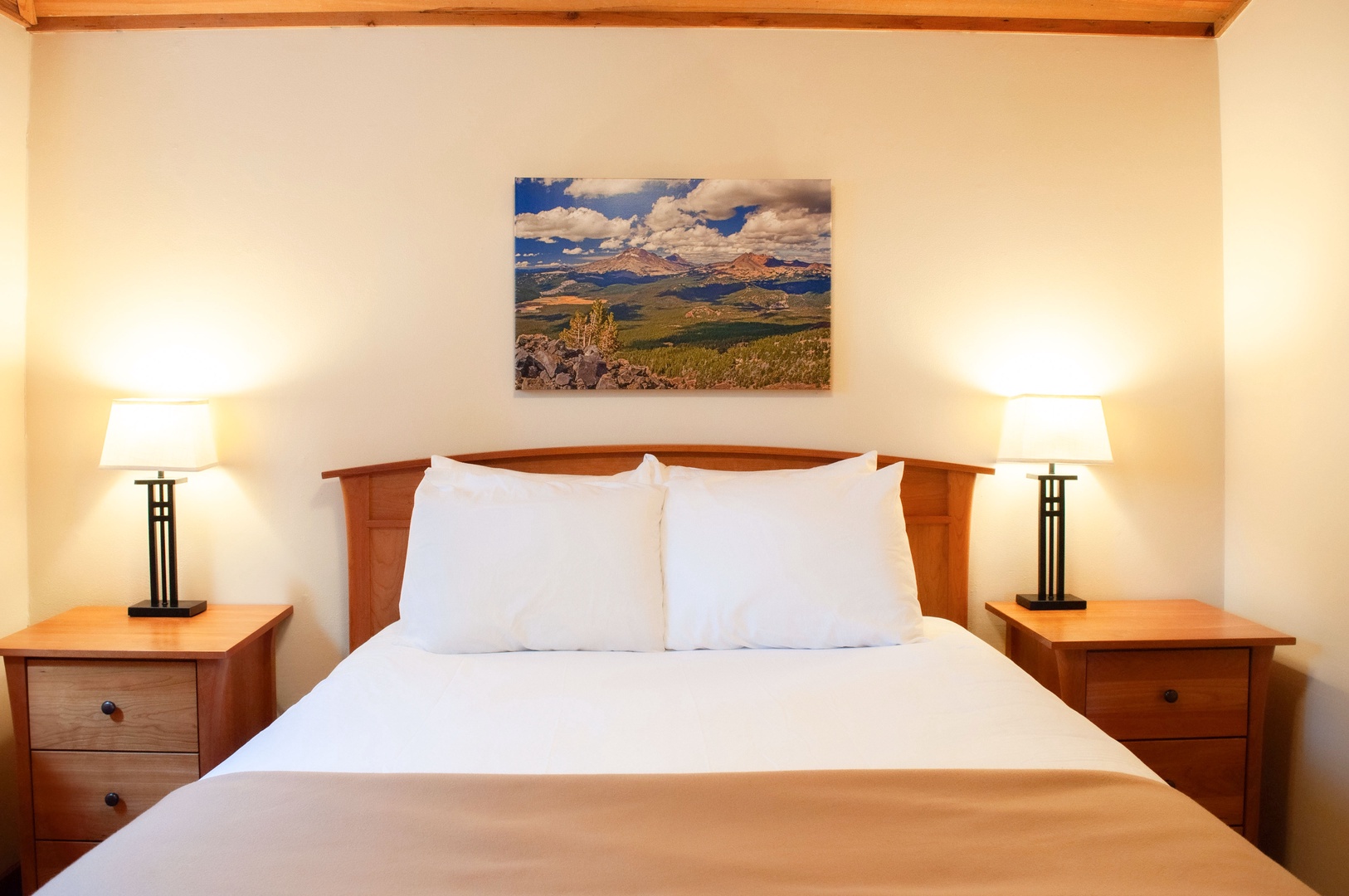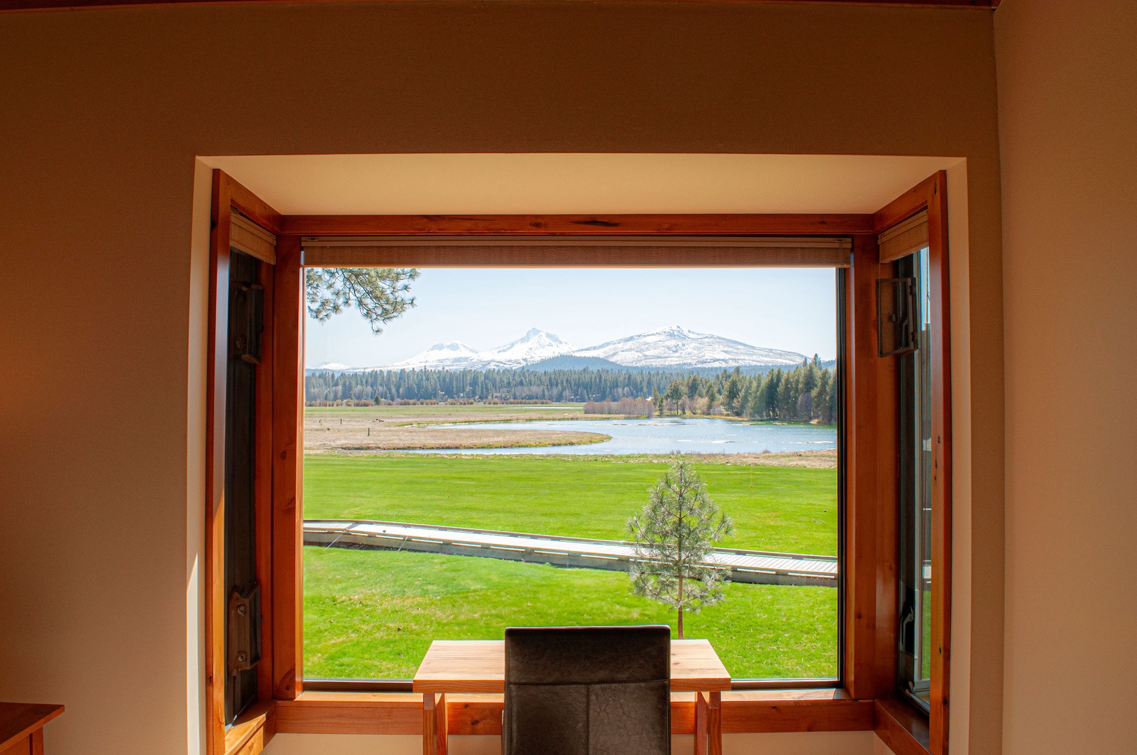 Enjoy the views of Phalarope Lake and the Three Sisters Mountain through the large picture windows and unique skybox architecture from the comfort of the couch. Just off the living room is a spacious deck feature easy step down access to the grassy area in front of the condo, and new patio furniture for lounging and dining. Also located on the main level of this two story condo is one full size bathroom and one guest bedroom with a new Beauty Rest pillow top queen size bed, new bedding, wall mounted flat screen TV, end tables, good lighting, and stackable washer and dryer hidden away in a laundry closet.