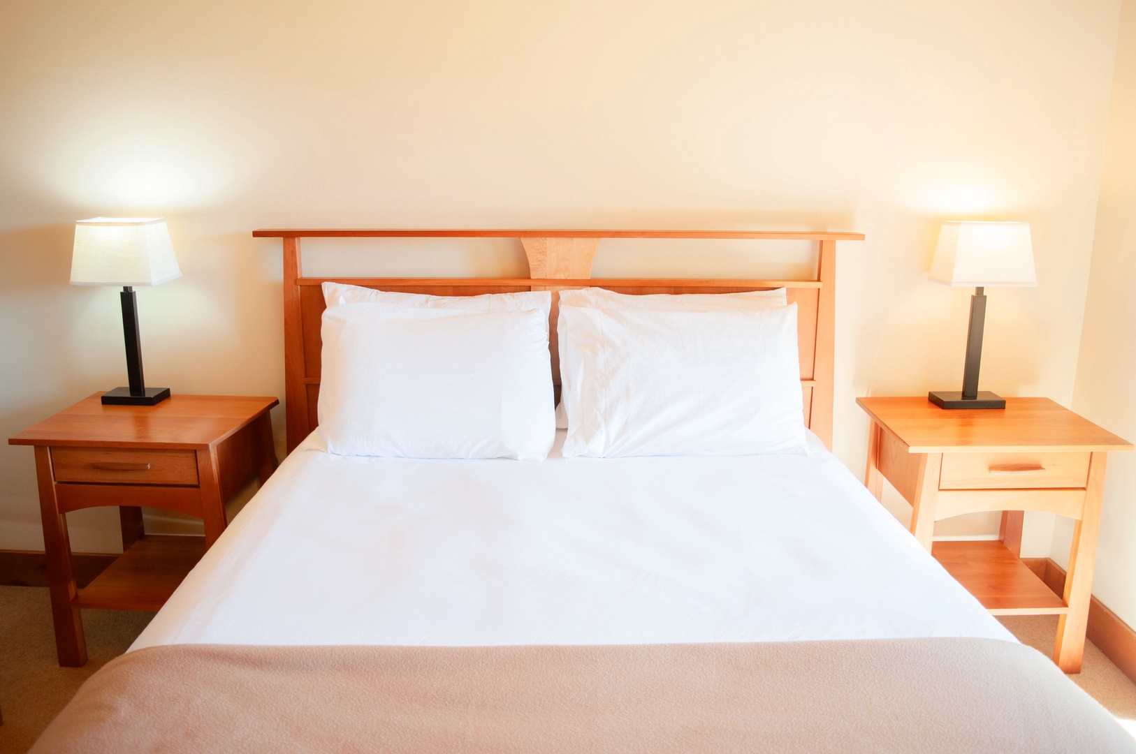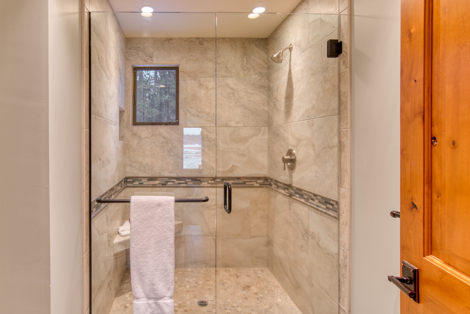 Moving upstairs guests will find a private master bedroom suite with a new Beauty Rest pillow top queen size bed, new bedding, dresser, night stands, good lighting, flat screen TV, and small work desk and chair. Open to the bedroom is the vanity area of the bathroom, with separate toilet and oversized shower where you can massage your feet on the pebble floor.