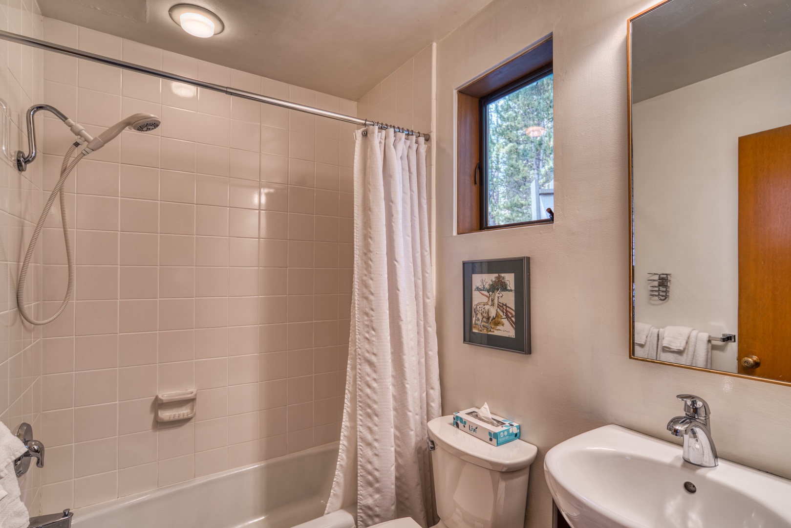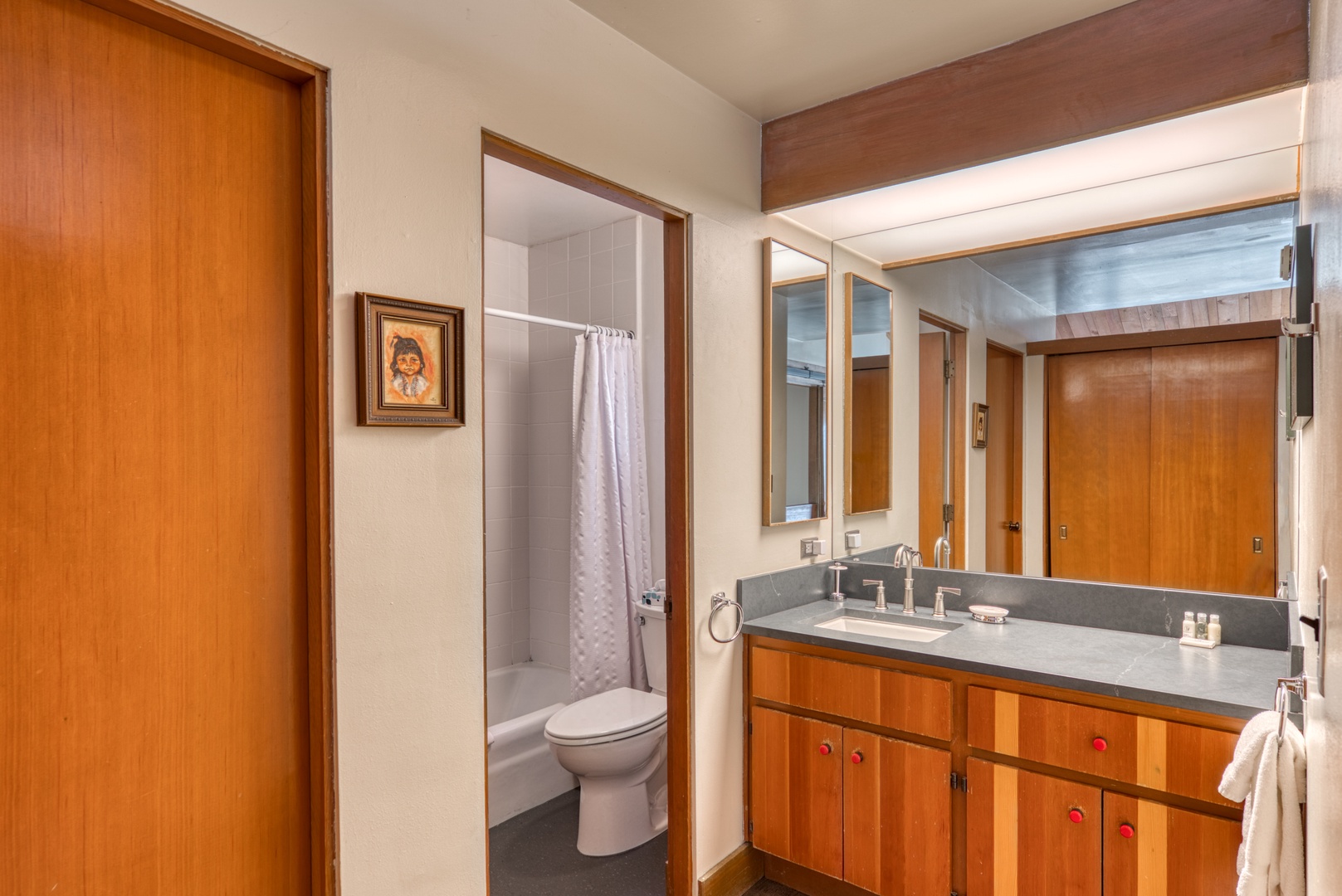 Upstairs – Both bedrooms are upstairs in this vacation rental. The Master features a king bed and a windowed alcove sitting area for reading and enjoying the view. It has a full bath and dressing room. The other bedroom has two twin beds. A washer and dryer are in the second bedroom. This house does not have a garage.