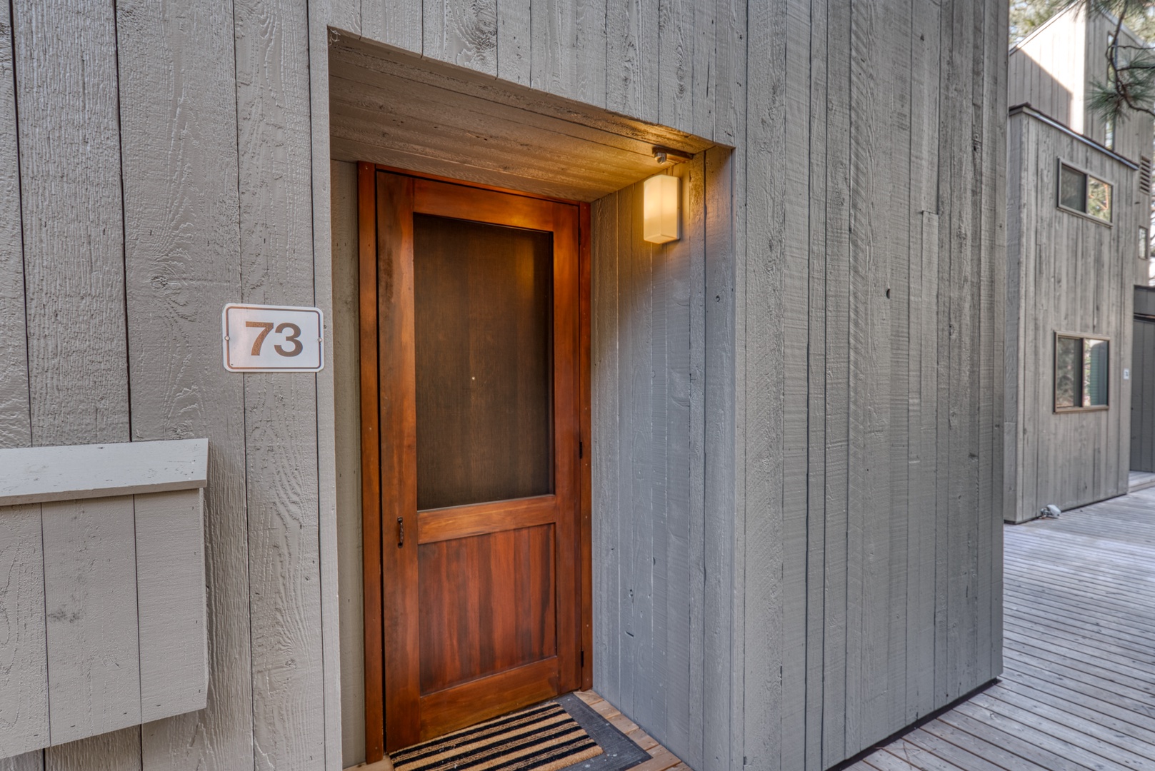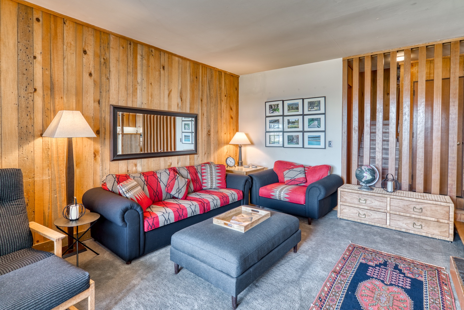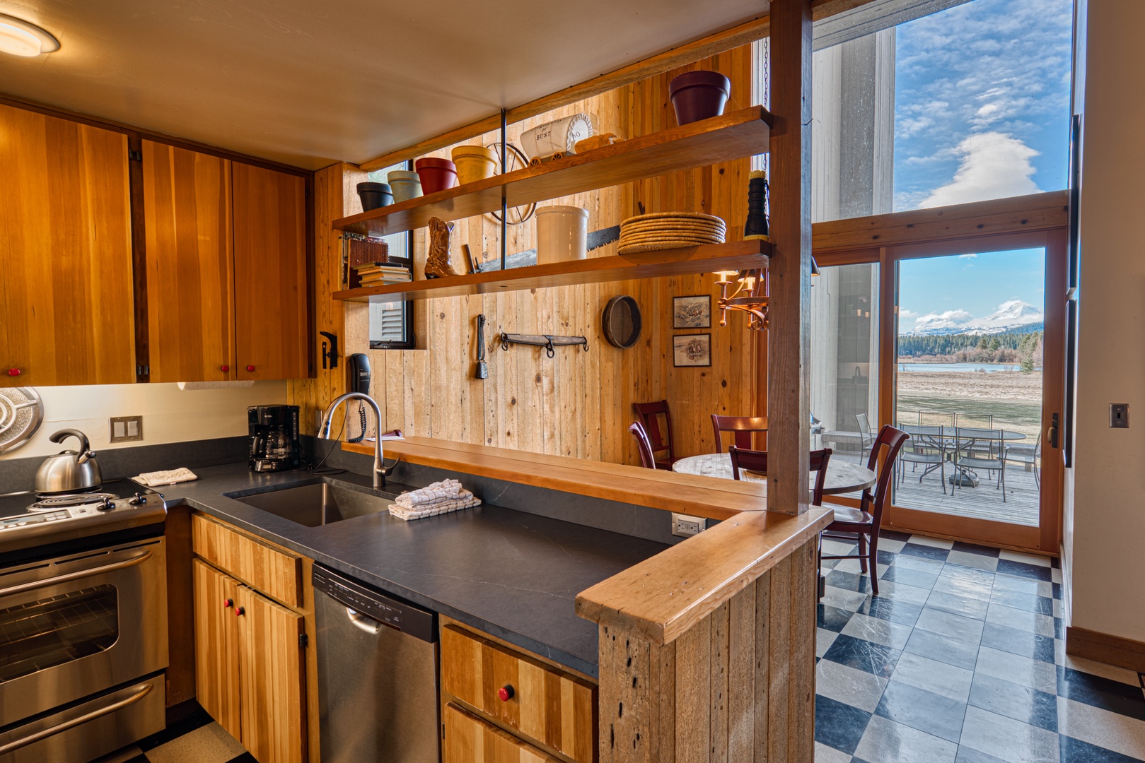 Country House Condo 073 has panoramic views of the meadow, lake and the Cascade mountains. The living room features a slate fireplace with a digital TV, DVD, VCR, MP3 compatible stereo and free wi fi throughout. Deck access is off the dining room. Comfortable outdoor furnishings are in place for relaxation on the deck, including a propane BBQ, perfect for the family evening at home. A full bath is also on the main level.