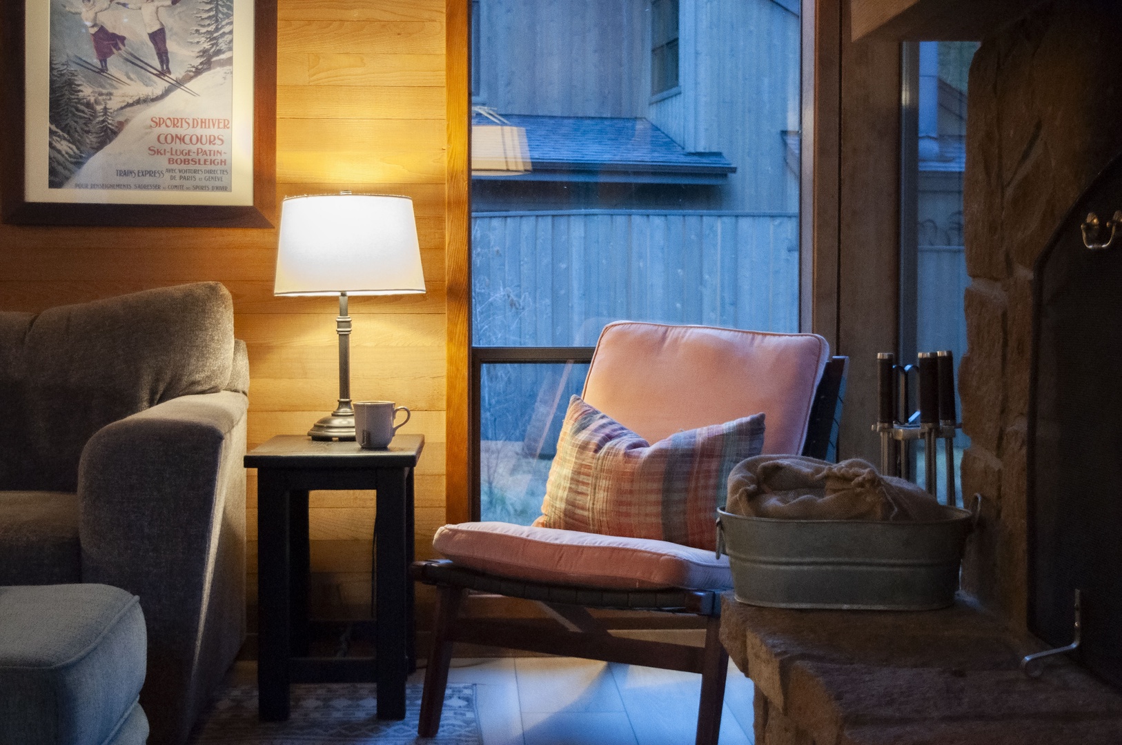 Curl up in your cozy armchair by the stone fireplace, where warm wood surrounds you and snowy views create the perfect winter retreat.