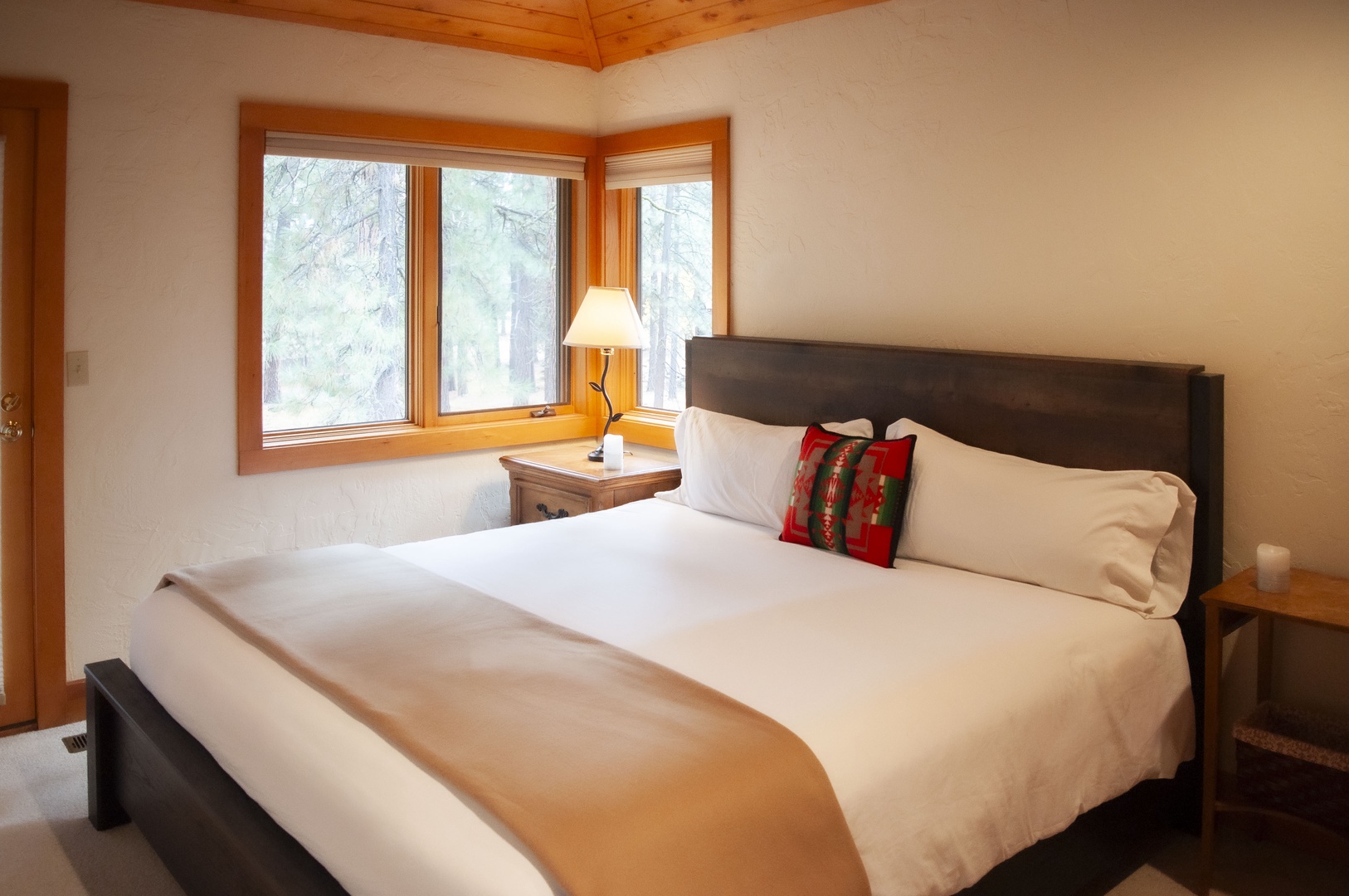 Heading up the stairs to the first landing of this split-level home you will find the primary king bedroom, complete with a private balcony. Next to the bedroom is the large primary bathroom with a skylight for natural light above the inviting soaker tub, a walk-in shower, and wash room. Two spacious closets separate the bedroom from the bathroom, providing guests with ample storage options.