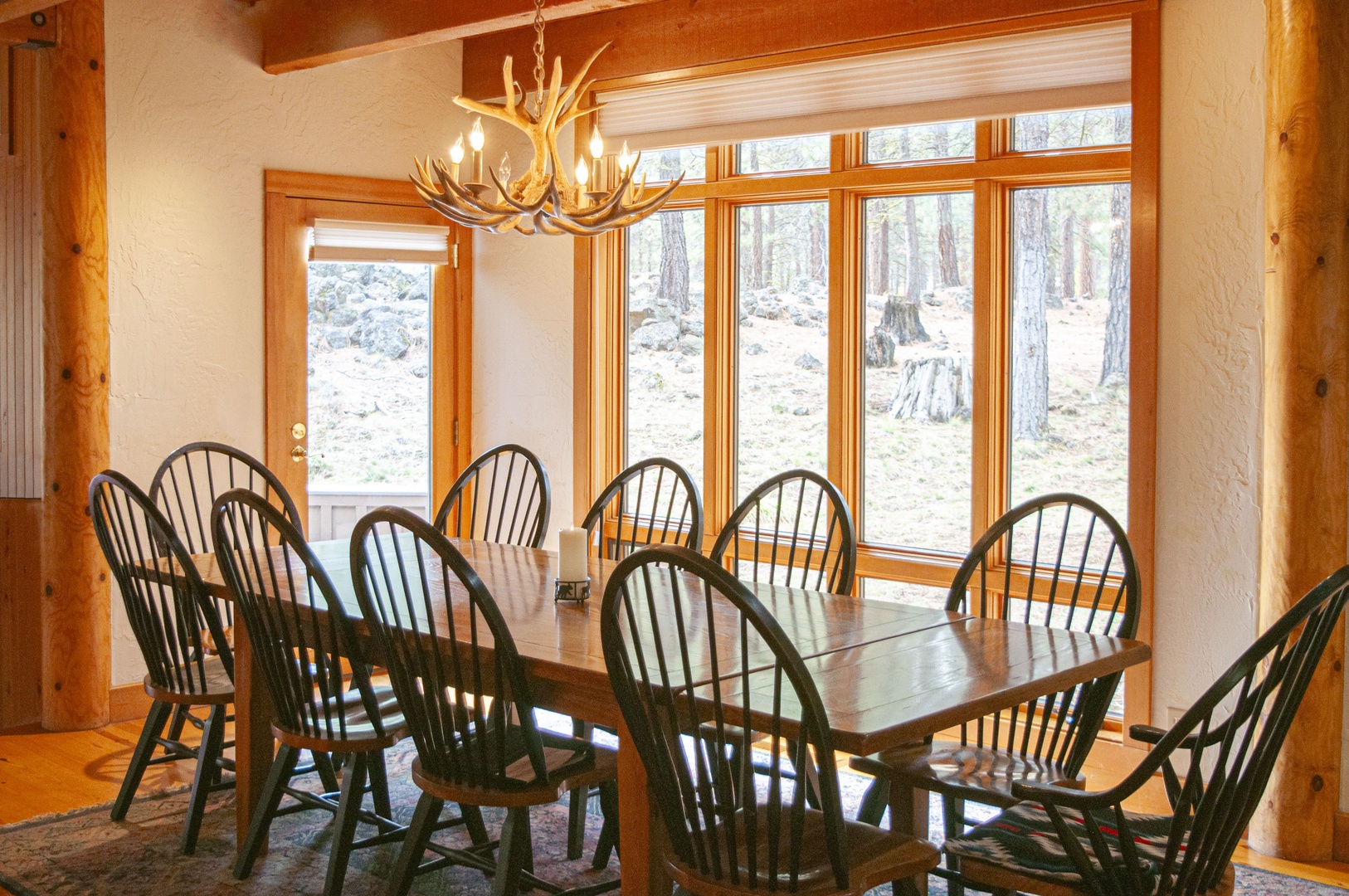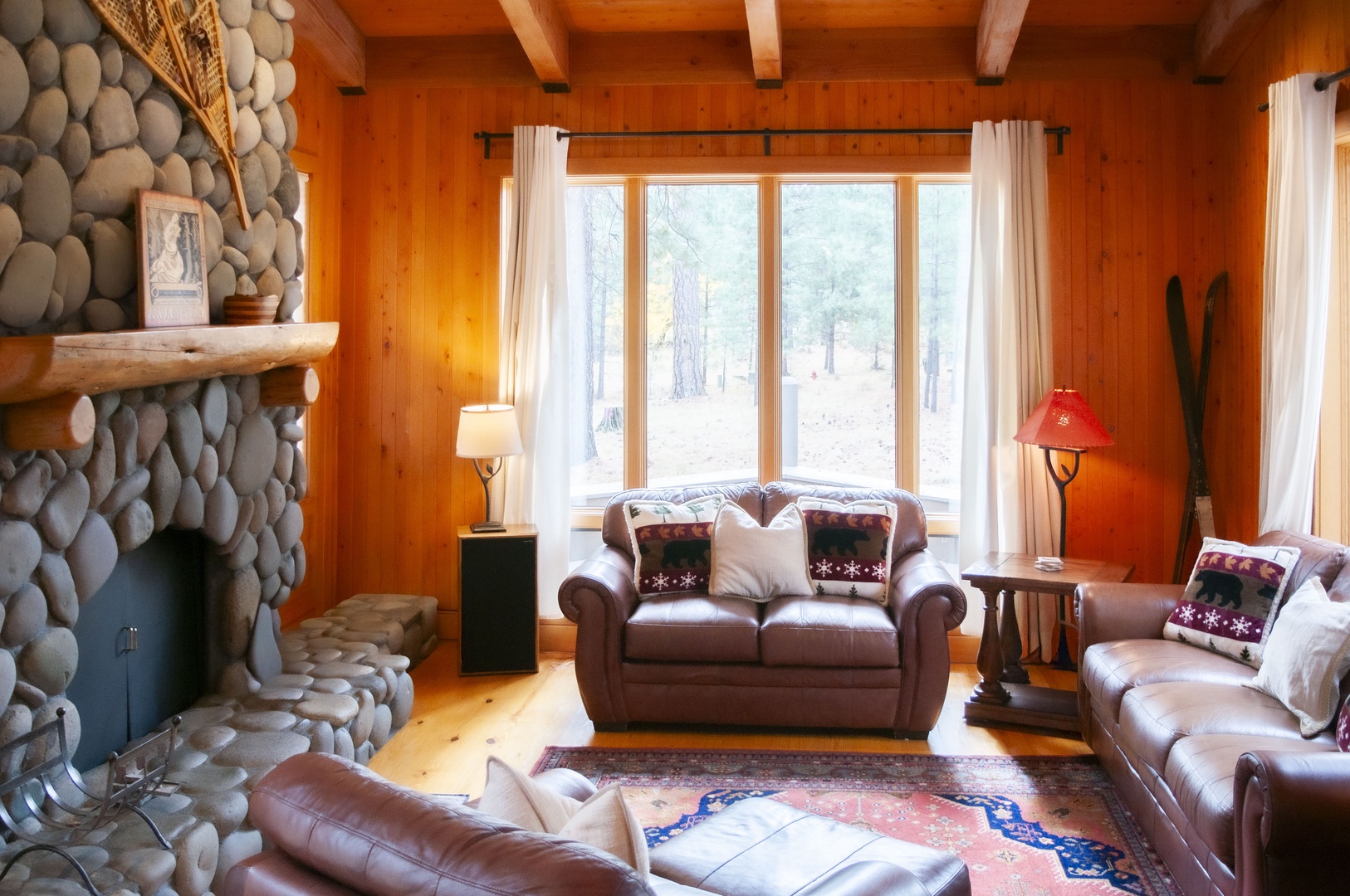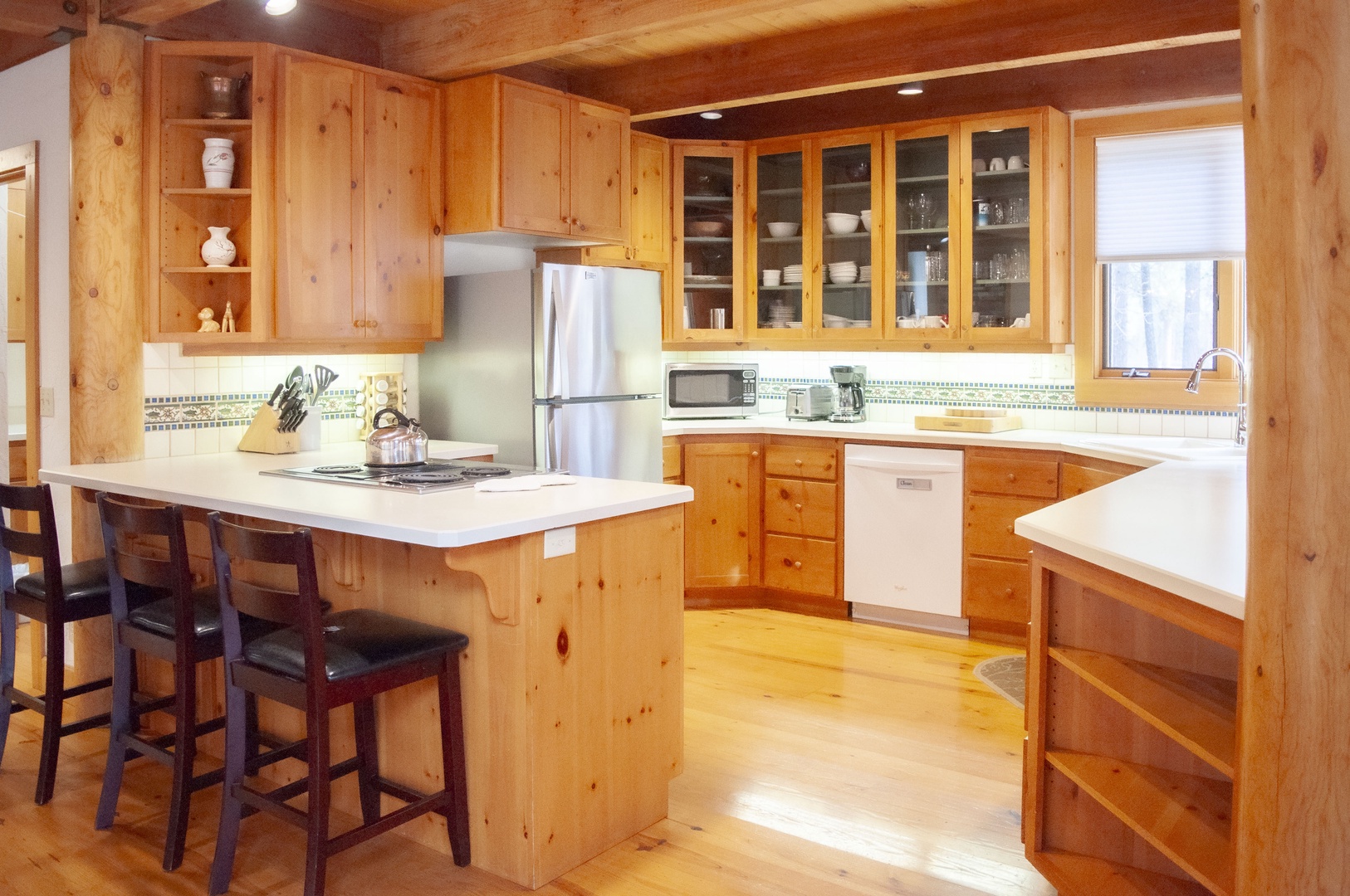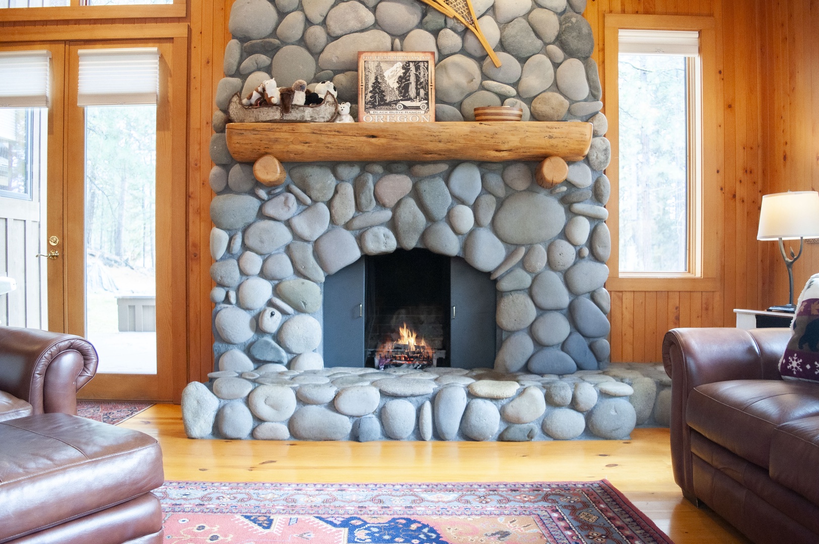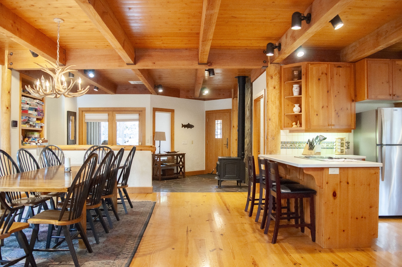 Upon entering this home, you are greeted by an inviting wood burning stove atop slate floors which transition into the wood floors for the remainder of the downstairs living quarters. The floor-to-ceiling windows provide an abundance of natural light to the expansive dining room table with seating for ten and the open concept kitchen with its small breakfast nook for three. On either side of this room is a door which leads to a wrap-around porch which encircles the downstairs living area and is complete with bench seating and a BBQ for summer cookouts. Stepping down into the sunken living room, you are welcomed by the river rock real wood burning fireplace in the cozy living area, perfect for the quiet night in. To the left of the front door, you will find the ¾ downstairs bathroom complete with a step-in shower and a large laundry room.