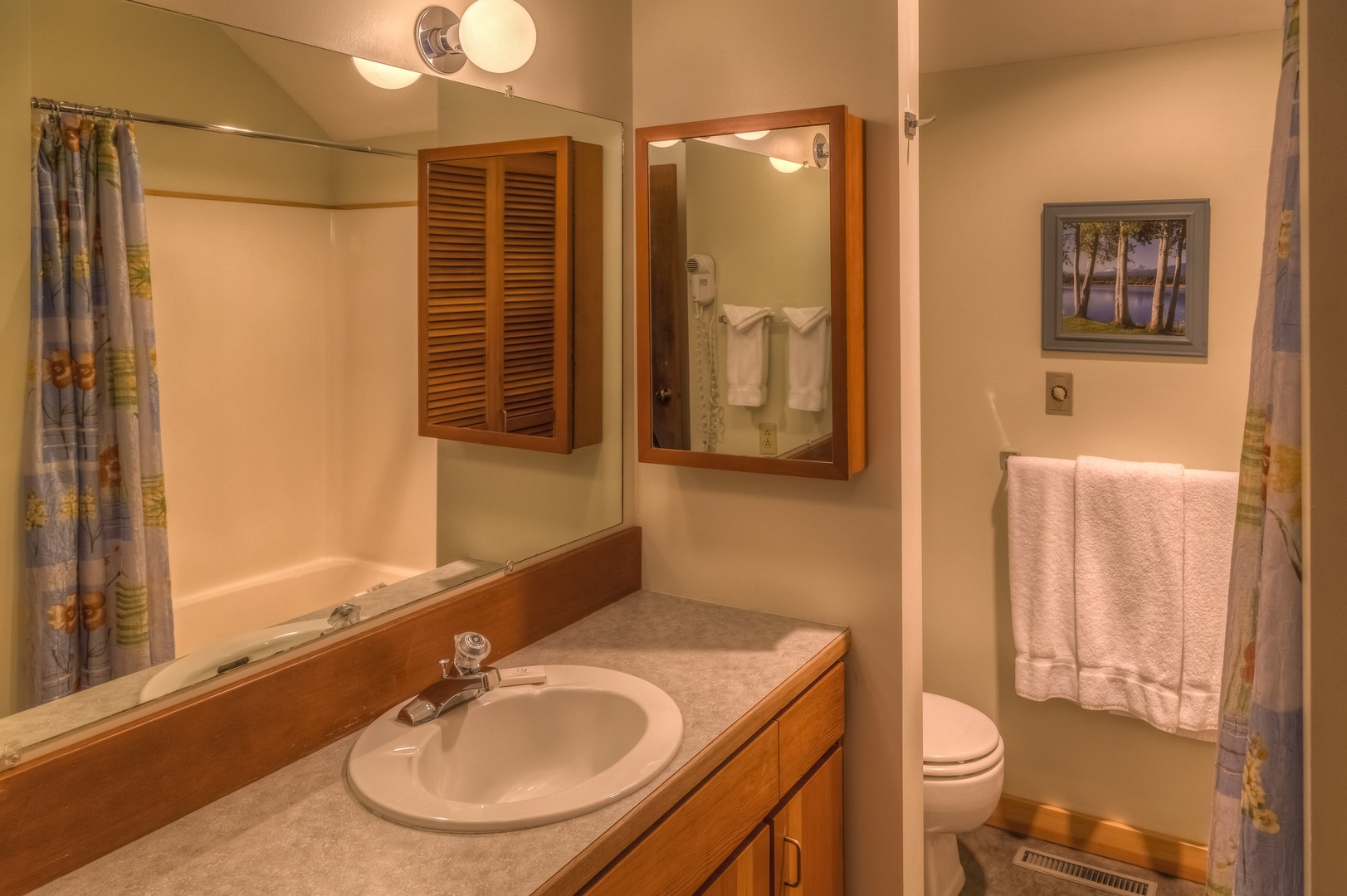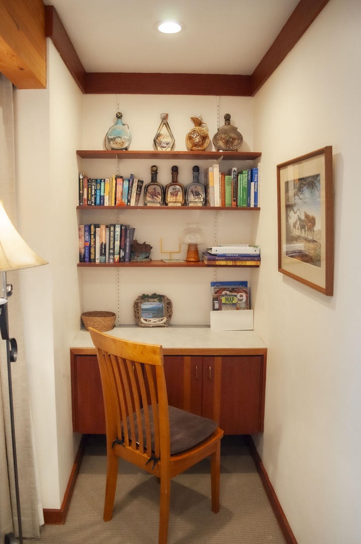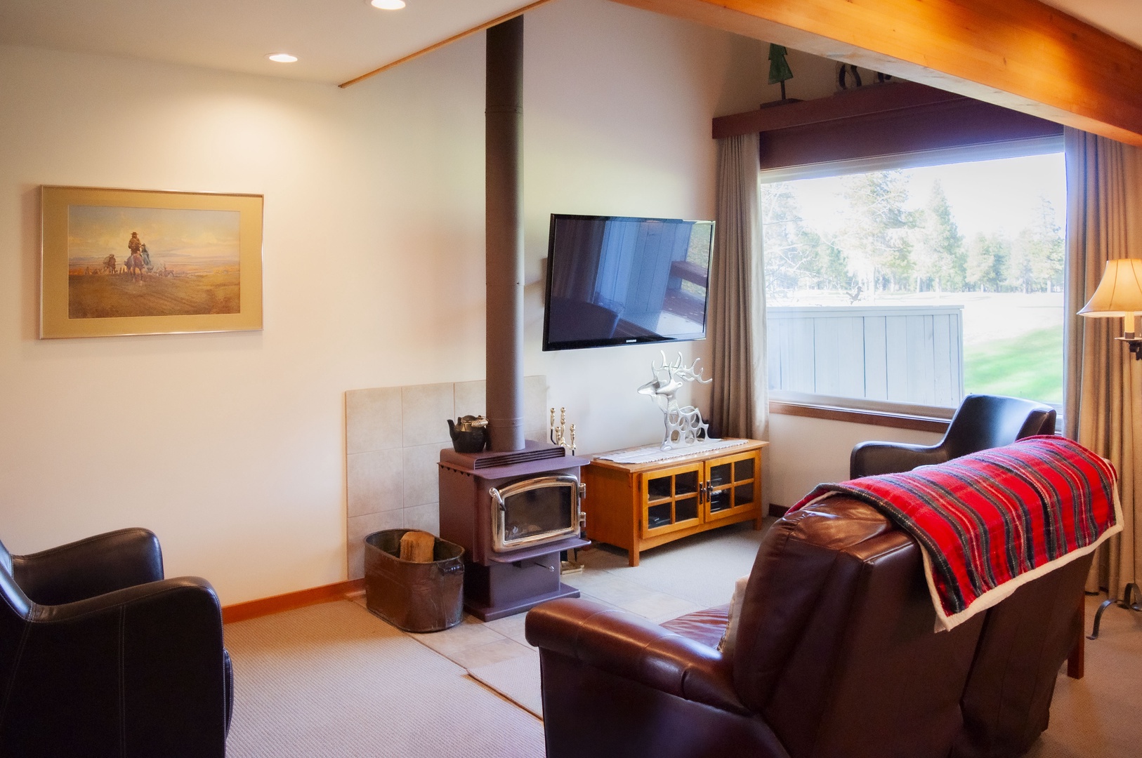 This condo sleeps six and has three bedrooms and two bathrooms. The main level includes a king bedroom, bathroom with washer and dryer, living room with large window views of the fairway, a wood stove, and TV/DVD with free WIFI. The dining space with seating for six and the well-equipped kitchen accesses the deck via a sliding glass door. The upper level has a loft bedroom with a queen bed, a third bedroom with two twin beds and TV/DVD, and a full bathroom.