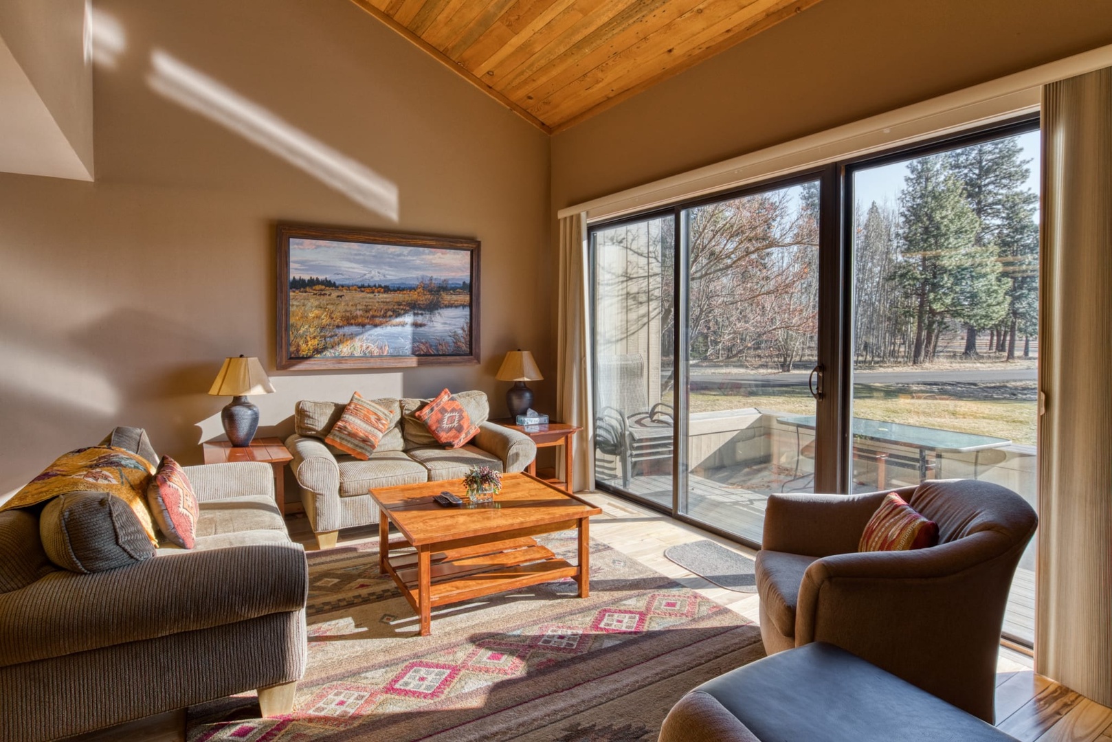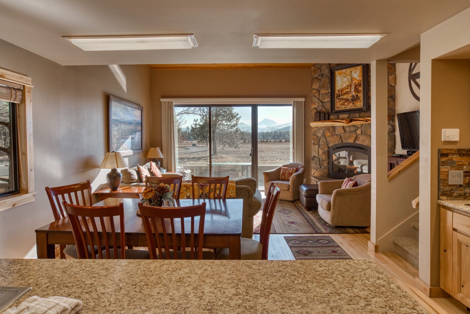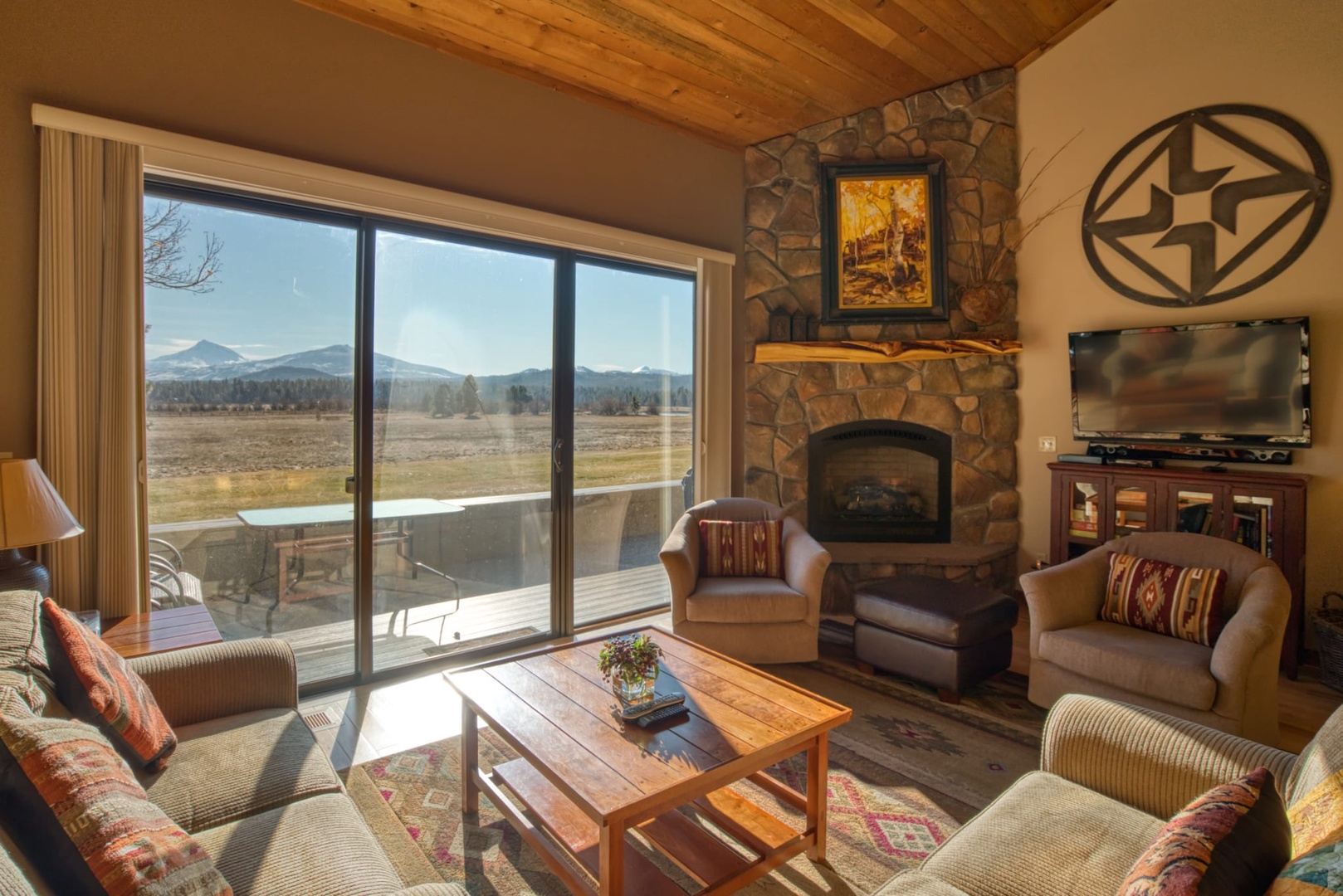 Lodge Condo 001 is a Premium rated, two bedroom, one full bathroom townhouse style condominium. LC 001 has recently been updated; including new mattresses, trim, deck, and flat screen TV. The dรฉcor and furnishings are a traditional Northwest style. Guests enter the condo into the fully equipped galley style kitchen and dining table for six guests. The kitchen and dining area flow into the living room; furnished with enough seating for six, flat screen TV/DVD, and fireplace. Access to the deck is through the slider off the living room. The deck is furnished with comfortable furniture for taking in the outstanding views of the Three Sisters and Mt. Washington. A gas BBQ grill is provided for your convenience. Moving up stairs is a full size bathroom and two bedrooms. The first guest bedroom is furnished with a king size bed, night stands, dresser and large closet. The second guest room has a queen and a twin bunk bed, night stands, dresser, good lighting and a closet. Lodge Condo 001 has a great location next to the Lodge Restaurant and Espresso Shop, swimming pool and tennis courts. Lodge Condo 001 can be connected to Lodge Room 002 and 003 to accommodate up to eight guests. This Lodge Condo does have a view of the mountains and meadow.