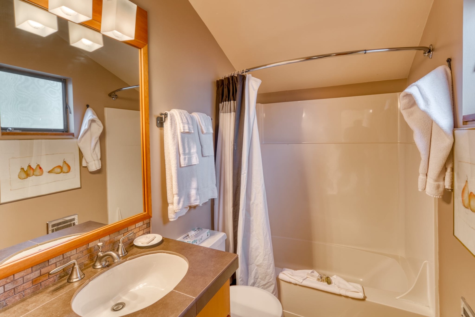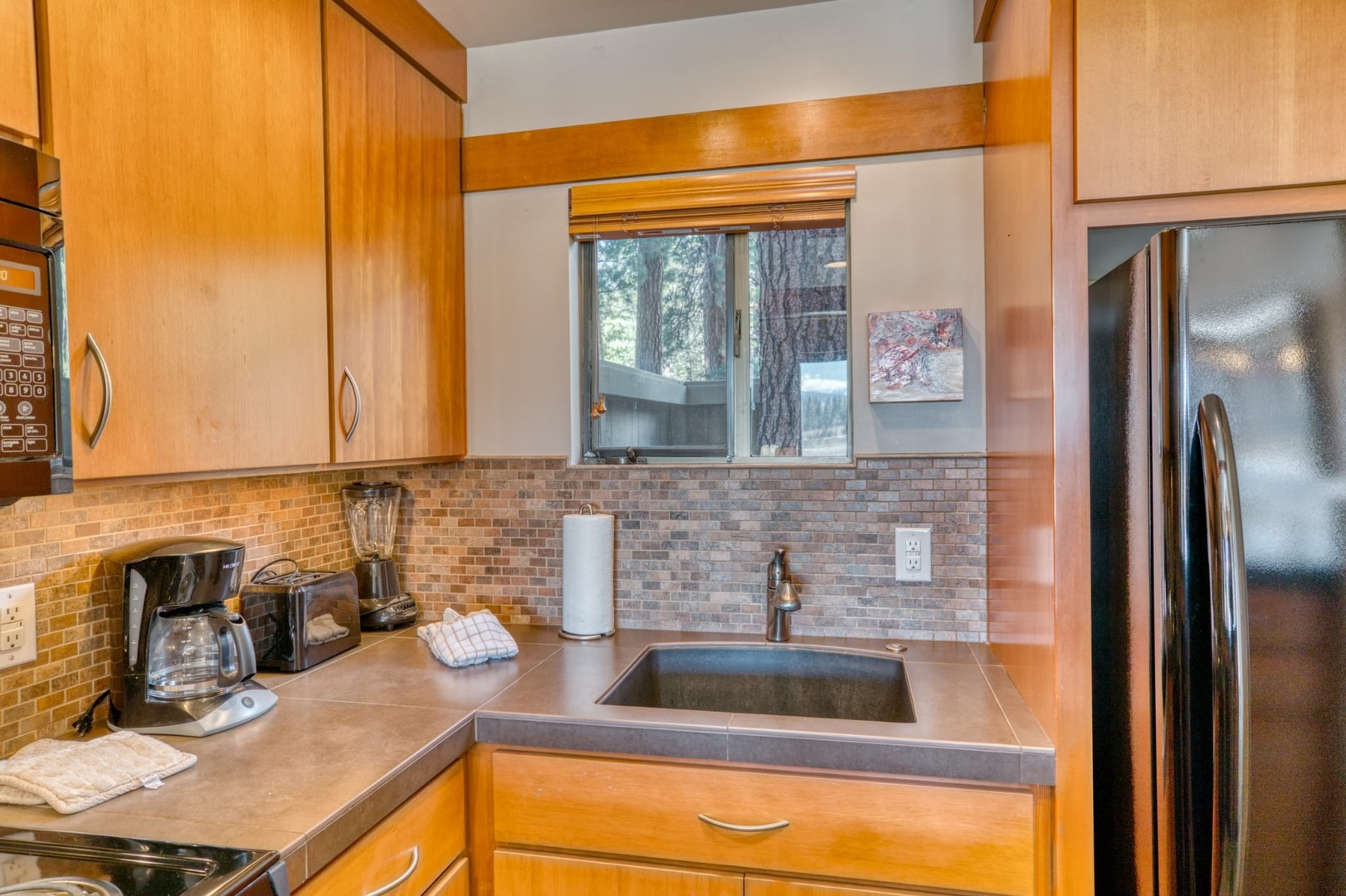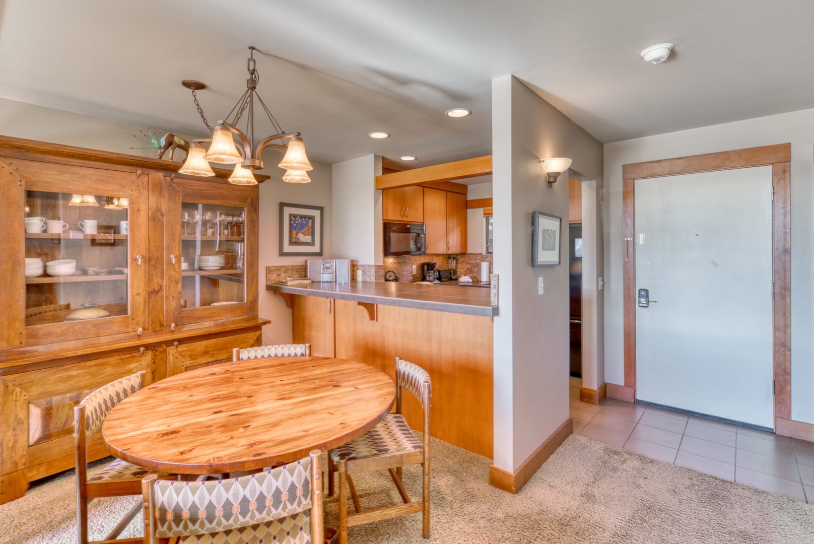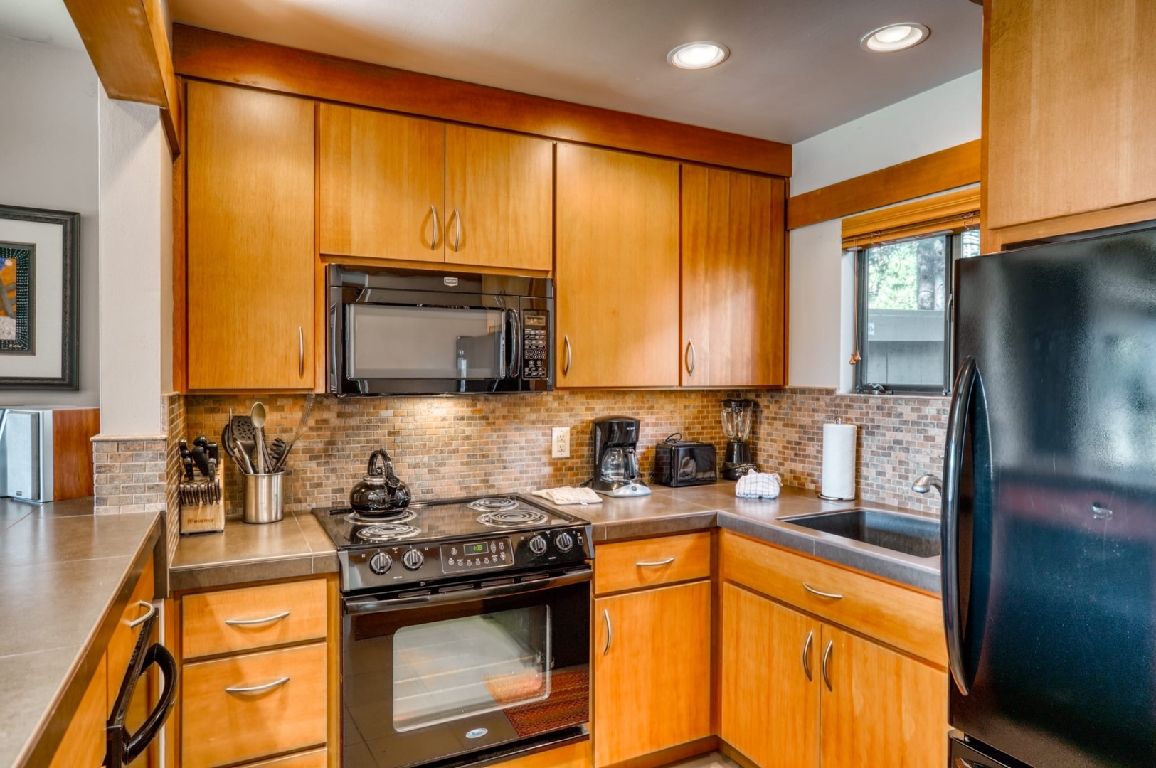 Lodge Condo 021 is a Signature rated, one bedroom townhouse style condominium. LC 021 has recently been updated; including the kitchen and bathroom. The dรฉcor and furnishings are traditional Northwest style of a high quality, including the art. Guests enter the condo into the fully equipped galley style kitchen with stainless steel appliances and dining table for four guests. The kitchen and dining area flow into the living room; furnished with enough seating for six, flat screen TV/DVD, and fireplace. Access to the deck is through the slider off the living room. The deck is furnished with comfortable furniture for taking in the outstanding views of the Three Sisters and Mt. Washington. A gas BBQ grill is provided for your convenience. Moving up stairs is a full size remodeled bathroom and one bedroom. The bedroom is furnished with a king size bed, night stands, dresser and large closet. Lodge Condo 021 has a great location next to the Lodge Restaurant and Espresso Shop, swimming pool and tennis courts. Lodge Condo 021 can be connected to Lodge Room 020 to accommodate up to four guests.