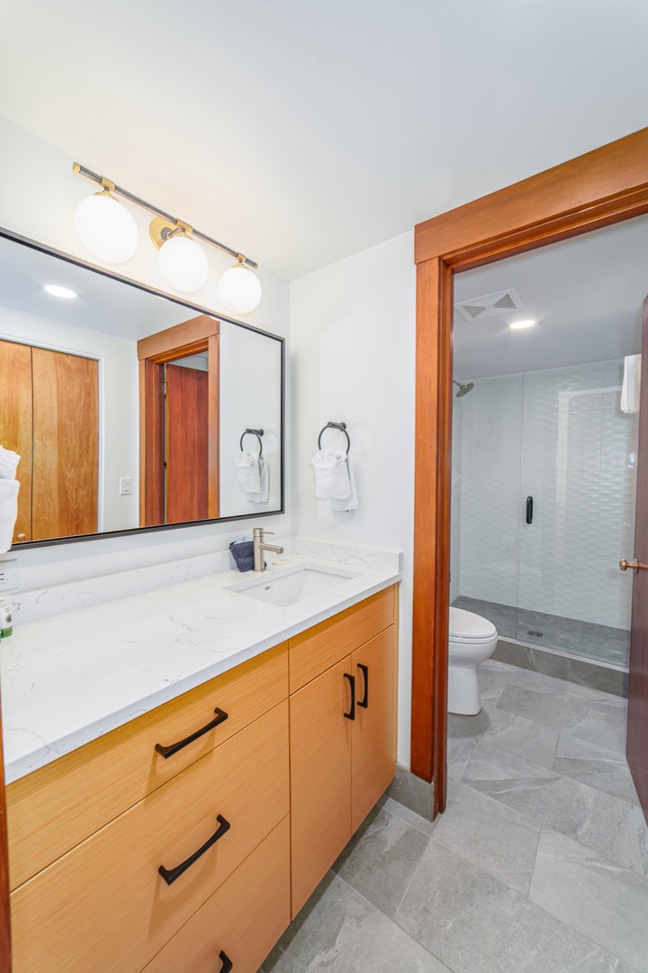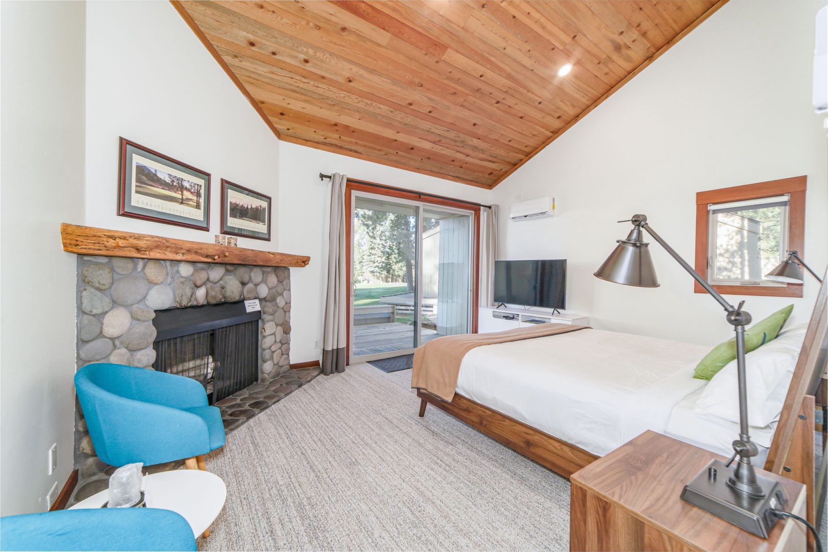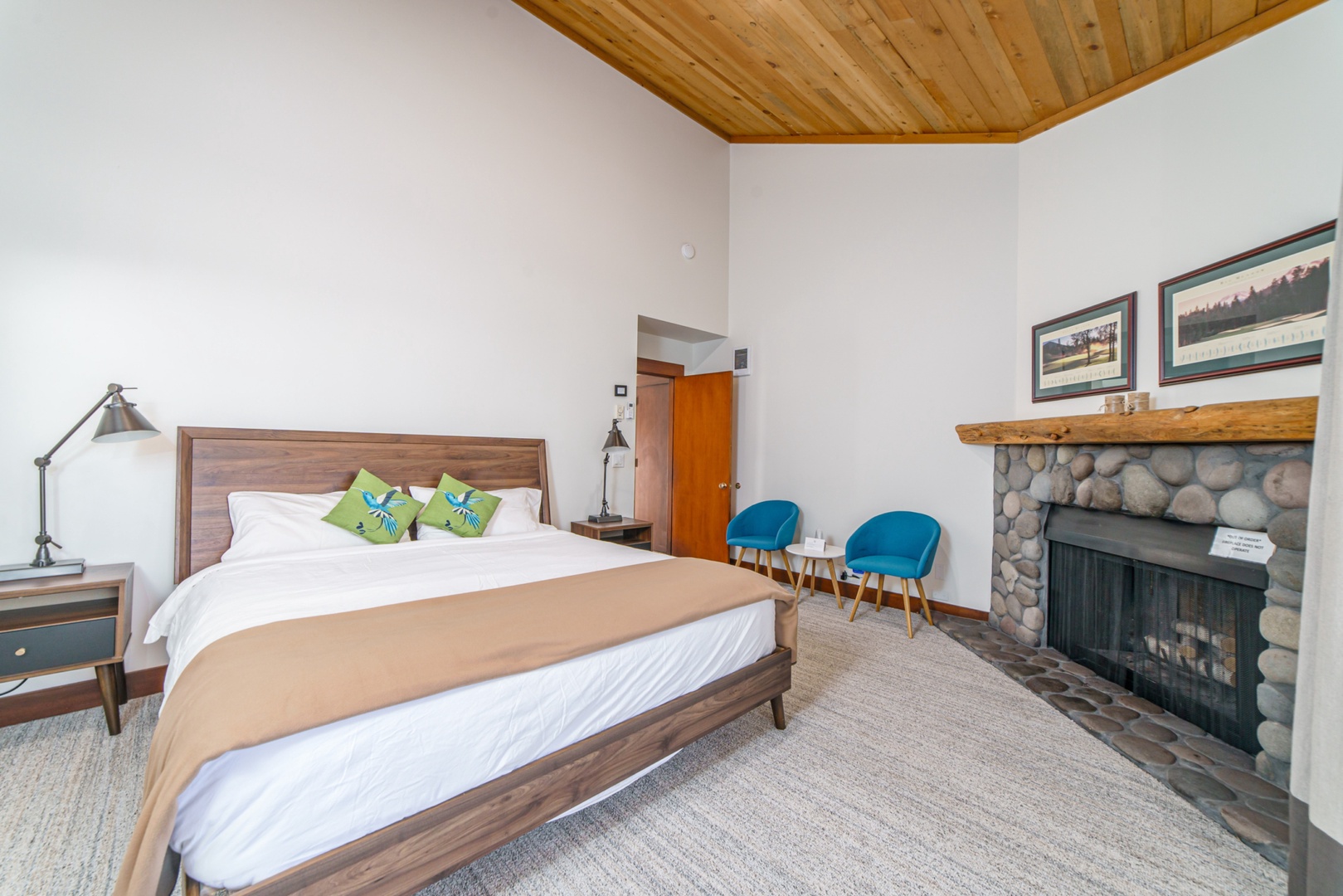 Take in fresh air and mountain views from this newly renovated lodge room. this cozy hotel style accommodation displays modern comforts of a king-sized bed, smart TV, and heated bathroom flooring. Delight in a beverage and watch the sun set and rise from across the meadow on the private deck. Back inside you will find a microwave, mini fridge, and coffee maker. Conveniently located by the Lakeside Bistro, pool, and Lodge Restaurant.