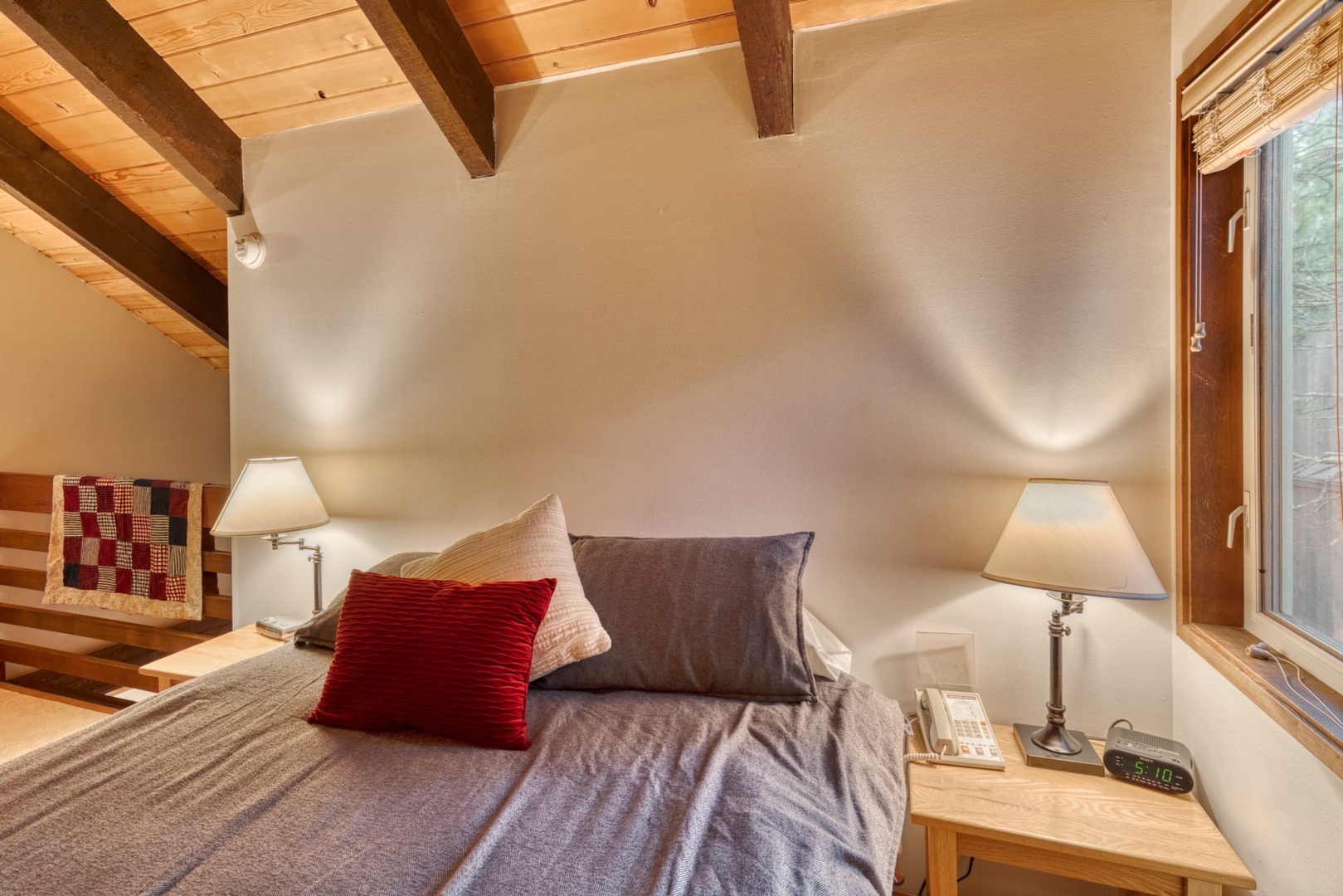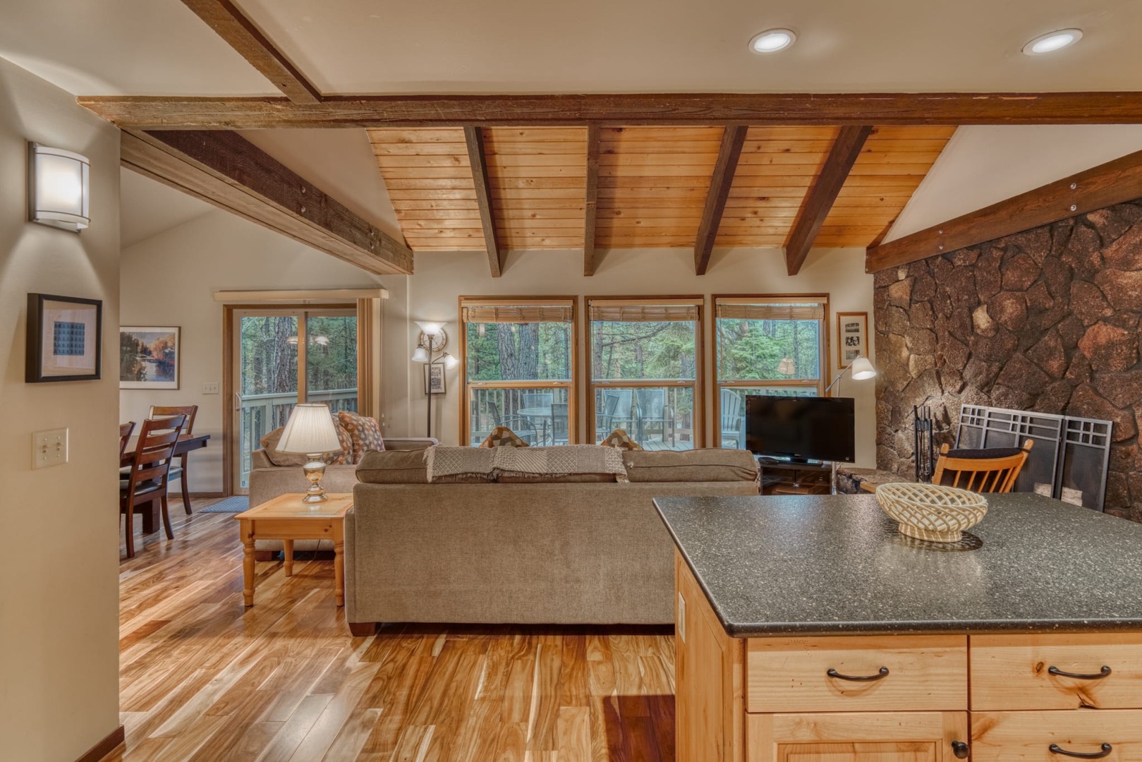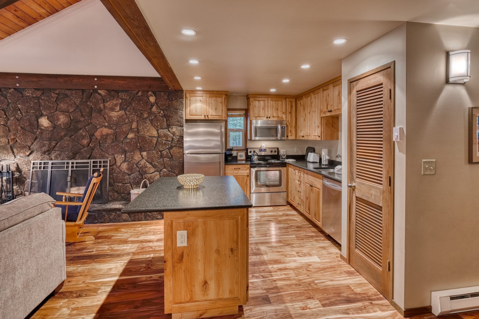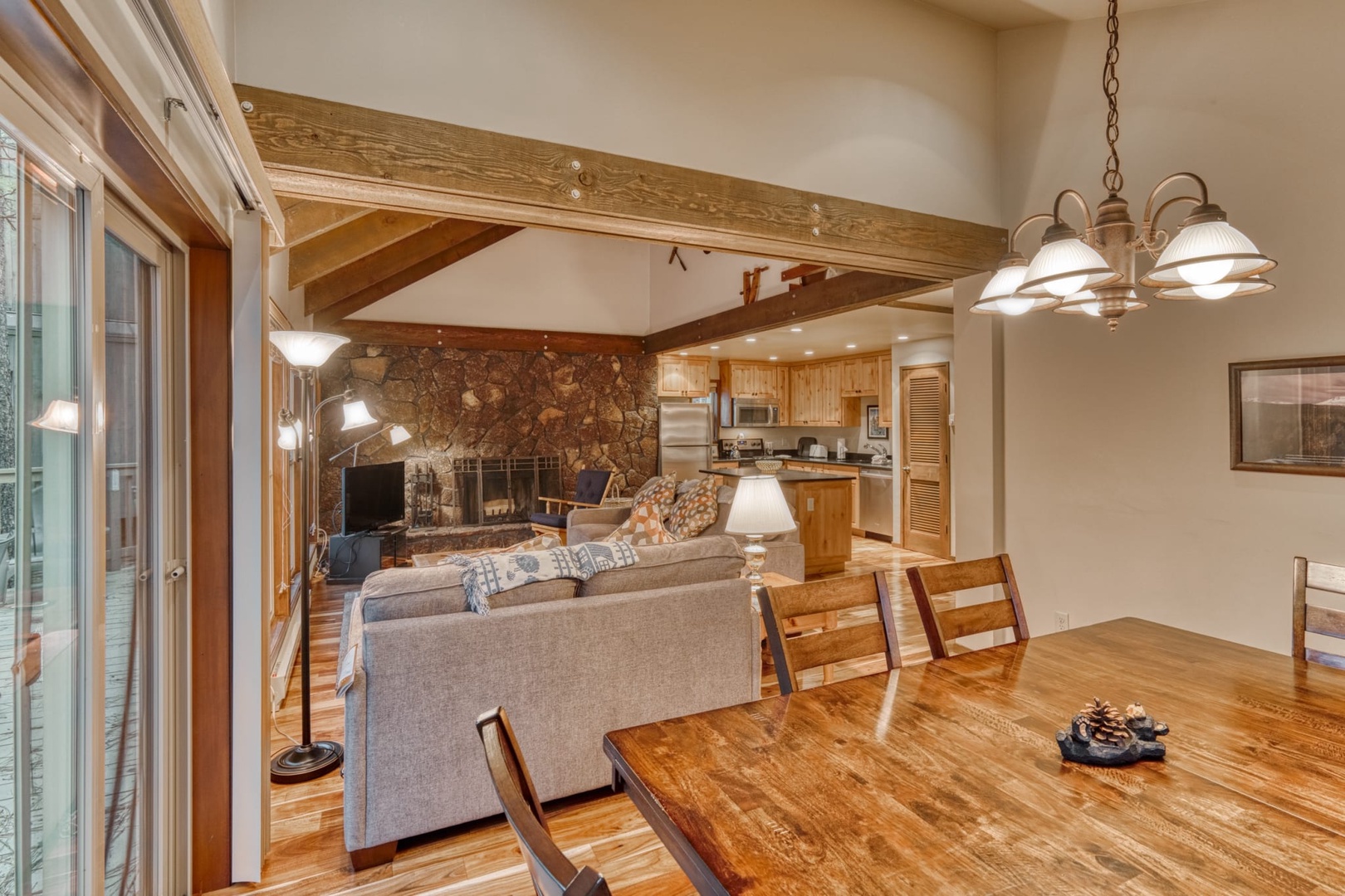 Upon entering RC 010 guests are greeted with an open floor plan on the main level and beautiful new wood floors. Immediately to the right of the front door is a newly remodeled shared hallway full bathroom with stackable washer and dryer. Across the entry way is a kid’s room with a bunk bed, dresser and vaulted ceiling. Next to the kid’s room is a bedroom with queen size bed, dresser, new bedding, and night stands; both the bunk room and queen bedroom have coat hooks on the wall for hanging clothes in lieu of closets. Also on the main level is the newly remodeled and expanded kitchen/living room and dining room. The kitchen features new: Counter tops, cabinets, cooking island, stainless appliances, and comes fully stocked with plates, glassware and pots and pans. The living room is furnished with a newer sectional couch, end tables, lamps and good natural light from the floor to ceiling windows, flat screen TV and fireplace. The dining area is just off the living room and kitchen and has a table for 4 – 6 guests, and a sliding glass door leading out to the deck. The deck has an outdoor dining table and BBQ. A 3rd sleeping area is located in the open area loft. The loft has a queen size bed, night stands and lamps, built-in armoire for hanging clothes and dresser drawers, small TV and private 3/4 bathroom.