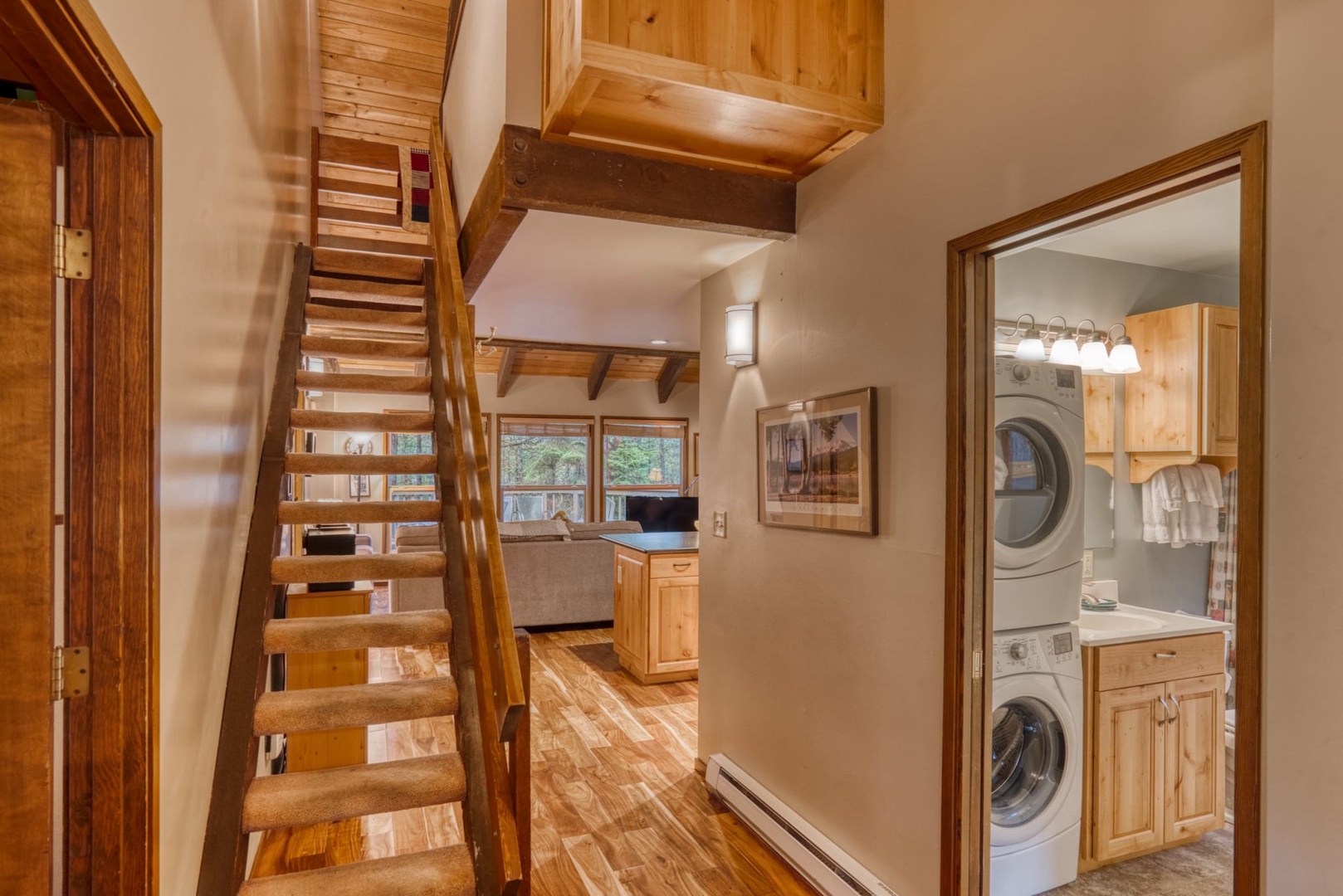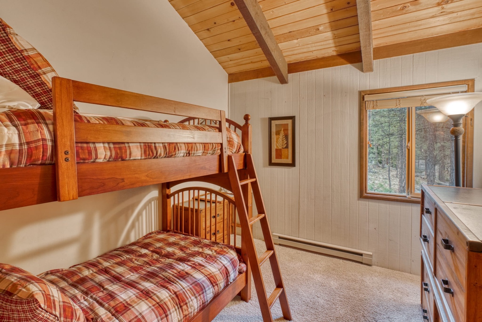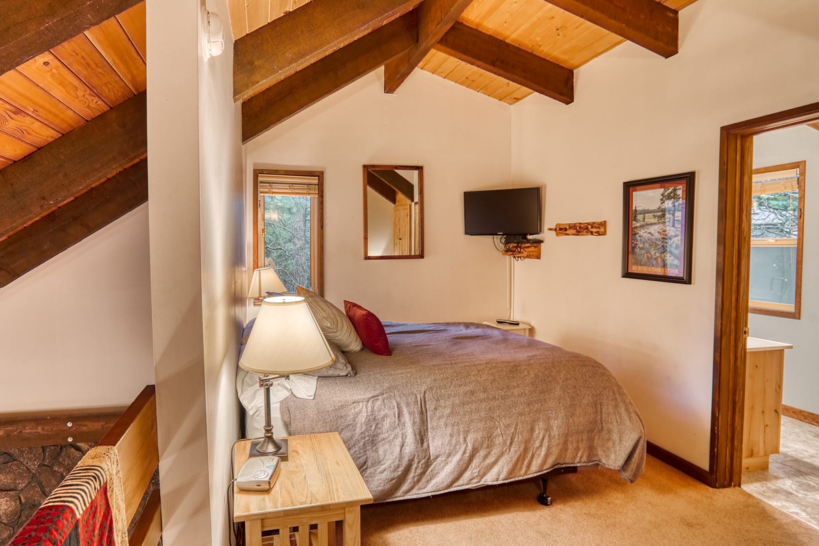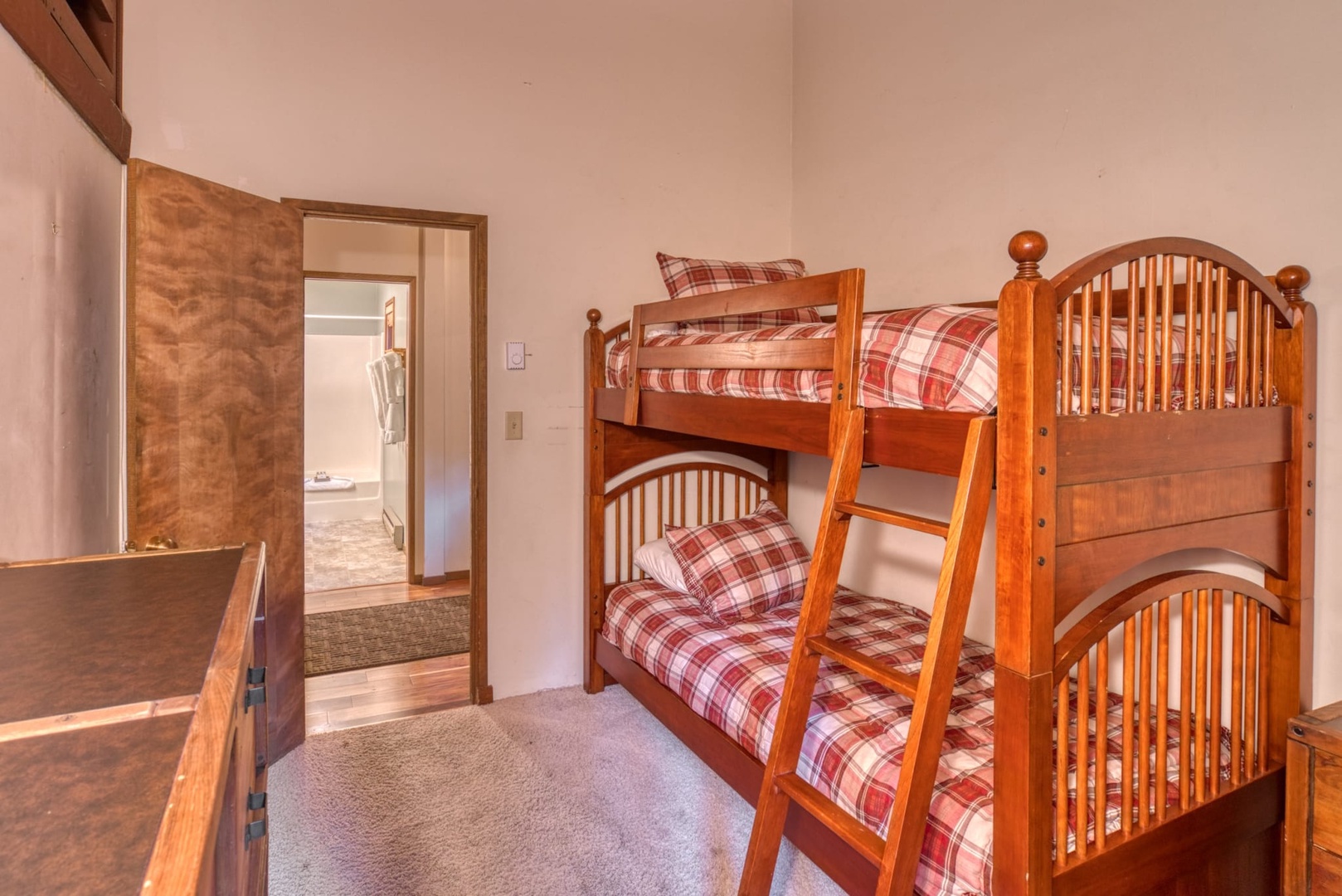 Upon entering RC 010 guests are greeted with an open floor plan on the main level and beautiful new wood floors. Immediately to the right of the front door is a newly remodeled shared hallway full bathroom with stackable washer and dryer. Across the entry way is a kid’s room with a bunk bed, dresser and vaulted ceiling. Next to the kid’s room is a bedroom with queen size bed, dresser, new bedding, and night stands; both the bunk room and queen bedroom have coat hooks on the wall for hanging clothes in lieu of closets. Also on the main level is the newly remodeled and expanded kitchen/living room and dining room. The kitchen features new: Counter tops, cabinets, cooking island, stainless appliances, and comes fully stocked with plates, glassware and pots and pans. The living room is furnished with a newer sectional couch, end tables, lamps and good natural light from the floor to ceiling windows, flat screen TV and fireplace. The dining area is just off the living room and kitchen and has a table for 4 – 6 guests, and a sliding glass door leading out to the deck. The deck has an outdoor dining table and BBQ. A 3rd sleeping area is located in the open area loft. The loft has a queen size bed, night stands and lamps, built-in armoire for hanging clothes and dresser drawers, small TV and private 3/4 bathroom.