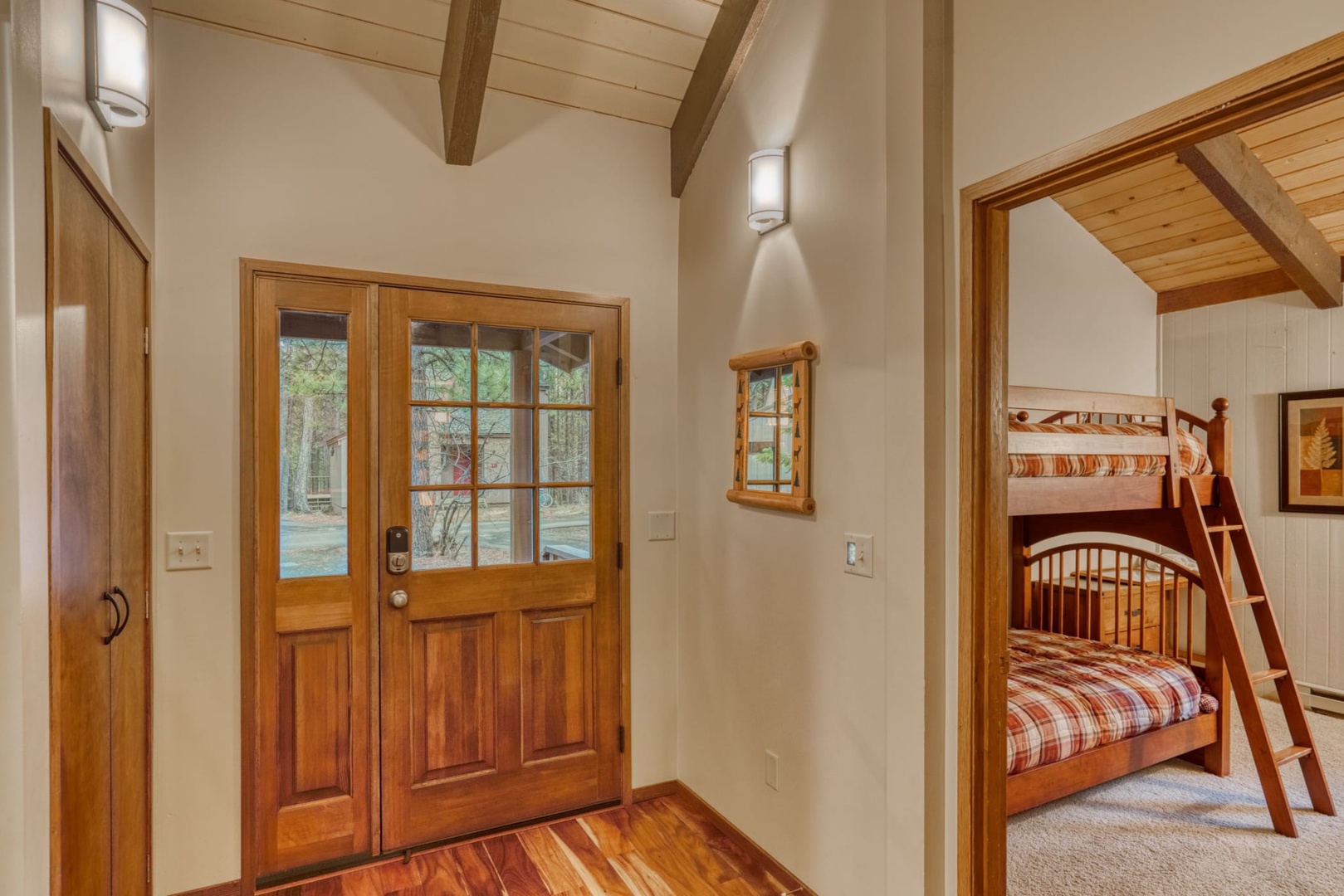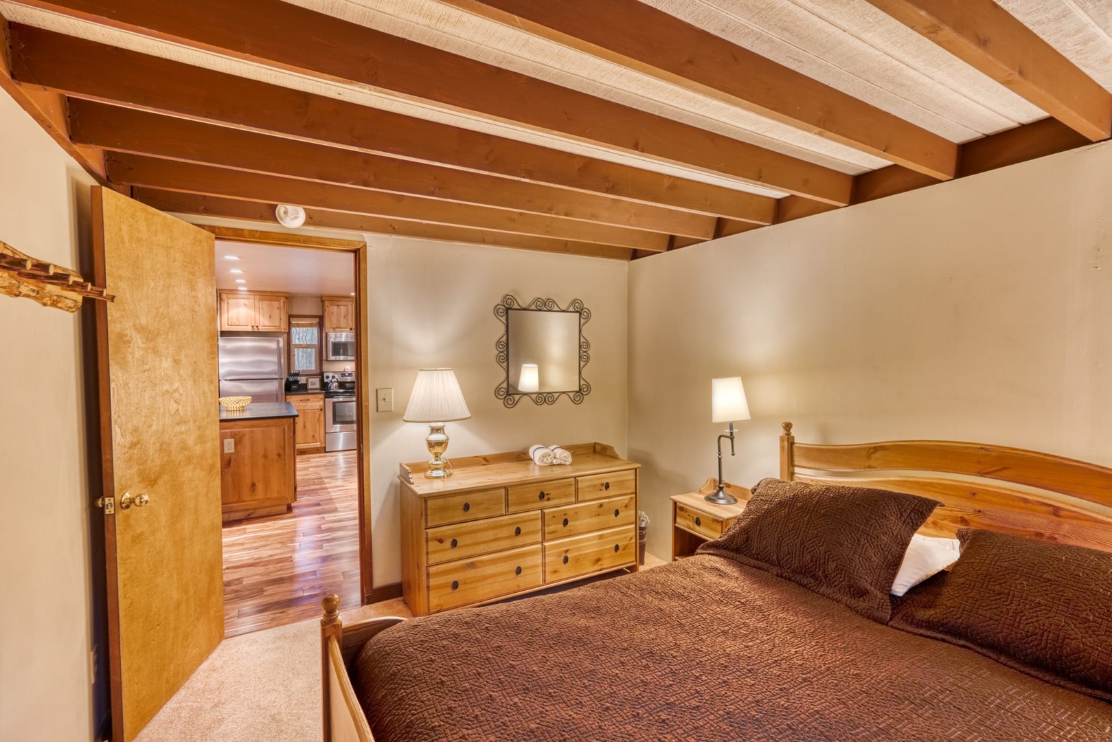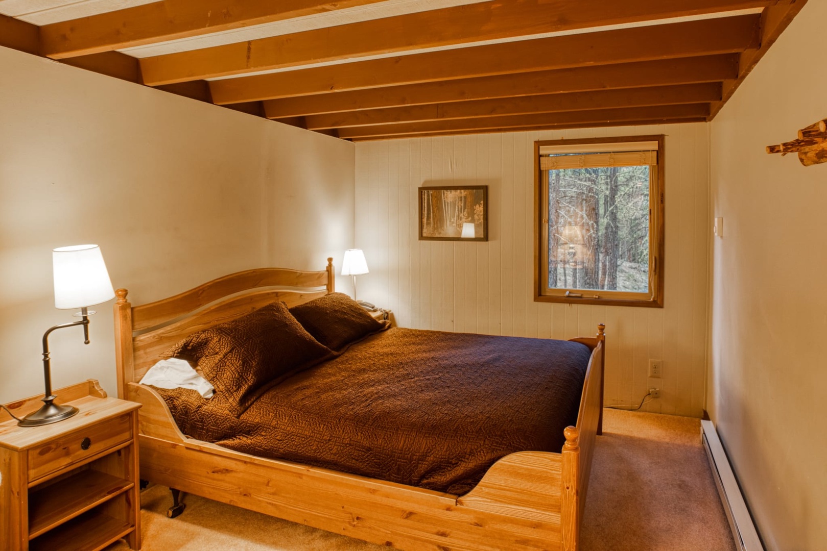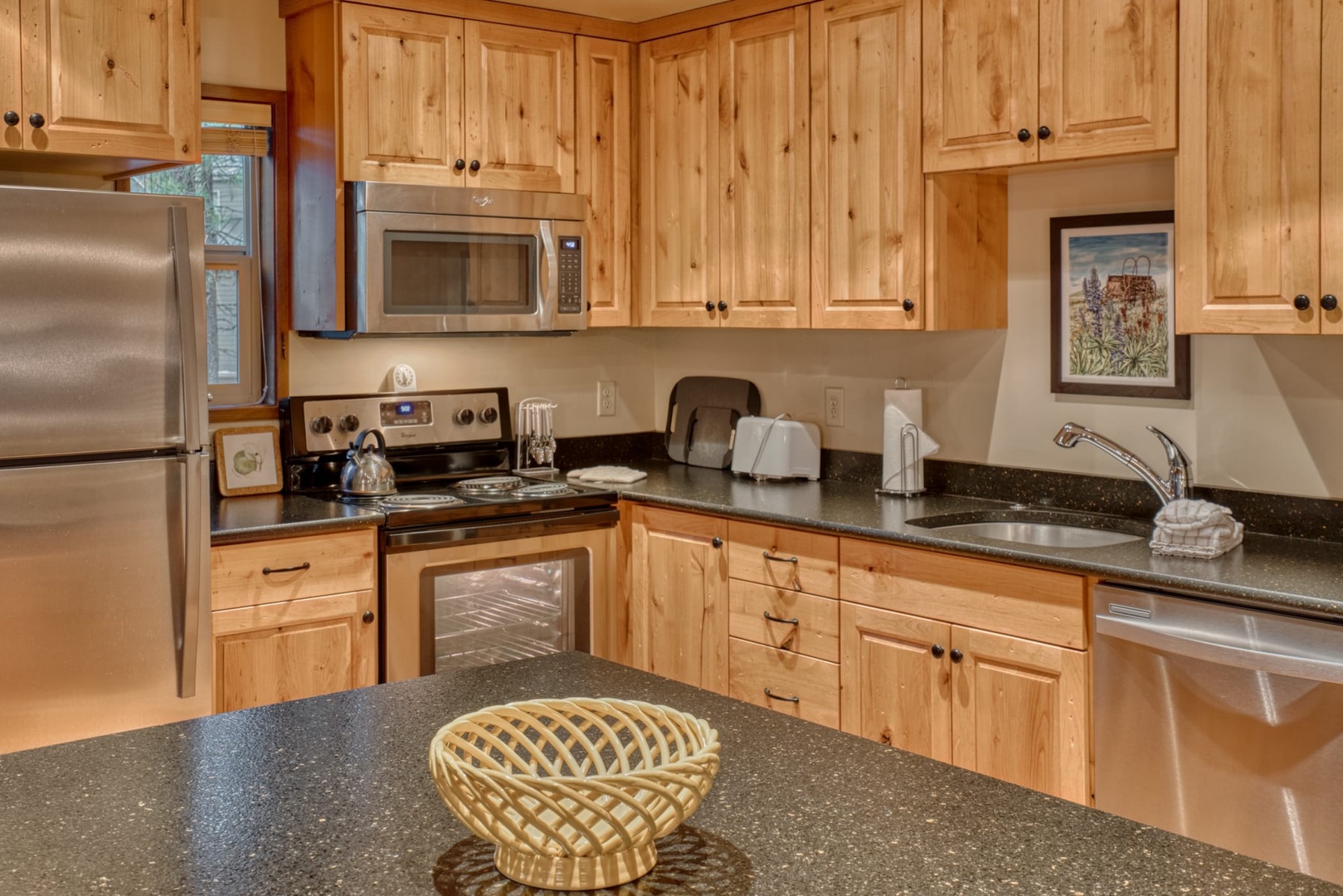 Upon entering RC 010 guests are greeted with an open floor plan on the main level and beautiful new wood floors. Immediately to the right of the front door is a newly remodeled shared hallway full bathroom with stackable washer and dryer. Across the entry way is a kid’s room with a bunk bed, dresser and vaulted ceiling. Next to the kid’s room is a bedroom with queen size bed, dresser, new bedding, and night stands; both the bunk room and queen bedroom have coat hooks on the wall for hanging clothes in lieu of closets. Also on the main level is the newly remodeled and expanded kitchen/living room and dining room. The kitchen features new: Counter tops, cabinets, cooking island, stainless appliances, and comes fully stocked with plates, glassware and pots and pans. The living room is furnished with a newer sectional couch, end tables, lamps and good natural light from the floor to ceiling windows, flat screen TV and fireplace. The dining area is just off the living room and kitchen and has a table for 4 – 6 guests, and a sliding glass door leading out to the deck. The deck has an outdoor dining table and BBQ. A 3rd sleeping area is located in the open area loft. The loft has a queen size bed, night stands and lamps, built-in armoire for hanging clothes and dresser drawers, small TV and private 3/4 bathroom.
